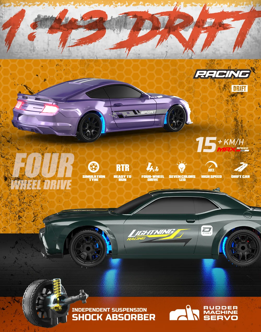 Classic and Dazzle Cool Modelling Design: This 1:43 Full scale Mustang Drift 2.4G Four-wheel Drive RC Car shell is based on an improved version of the classic model car. Made of high toughness PVC and color-changing process, the color can change from blue to purple in the light. Equipped with high-brightness headlights allow you to quickly locate the remote control drift car in the dark.