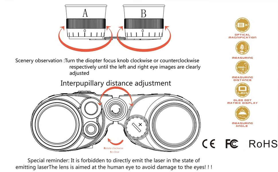 Built for Durability and Safety: Constructed with durable materials of PC and fiberglass, these binoculars are IP65 waterproof rated and designed for outdoor use. With Class 1 safety level and safety measures for the 905nm laser, they provide a safe and reliable experience for users.