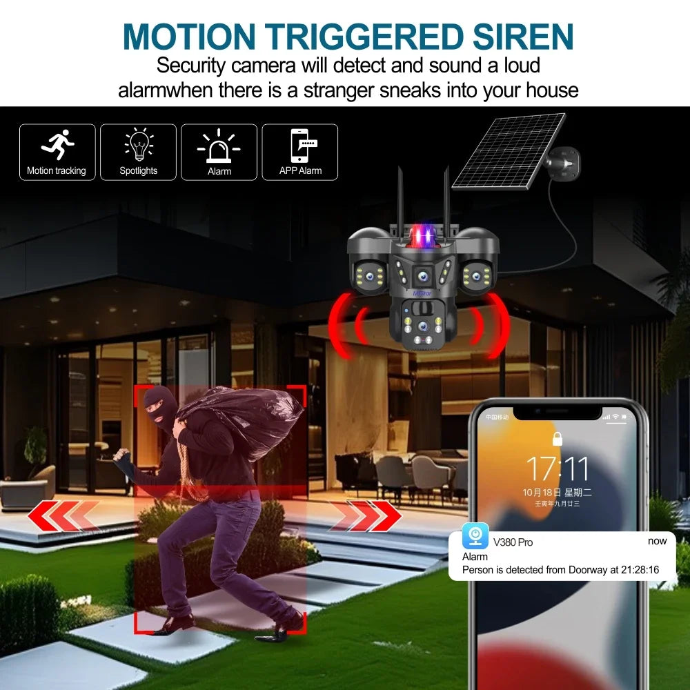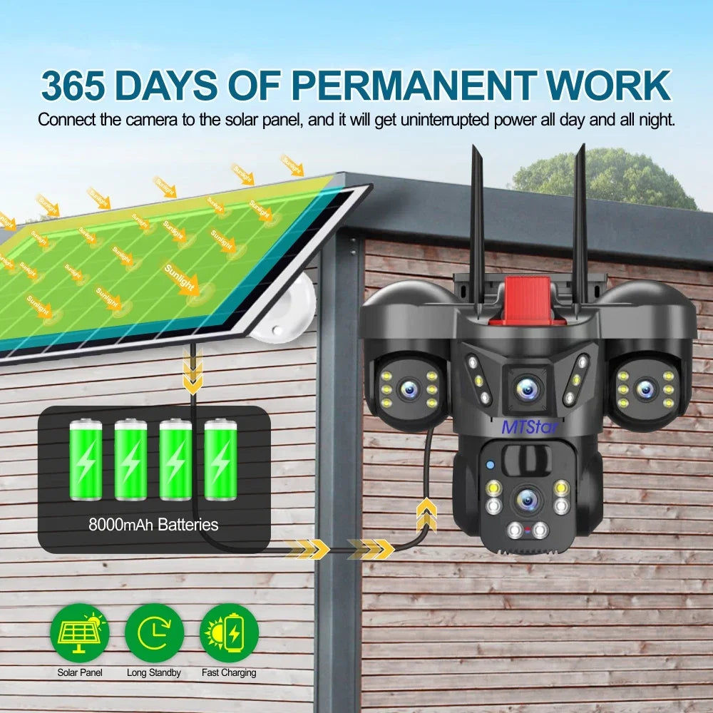 15MP 4K Solar Wifi Security Camera 3 Lens 3 Screens PTZ 10X Zoom Outdoor Wireless Secure 360 Auto Tracking Smart Home CCTV Cam
