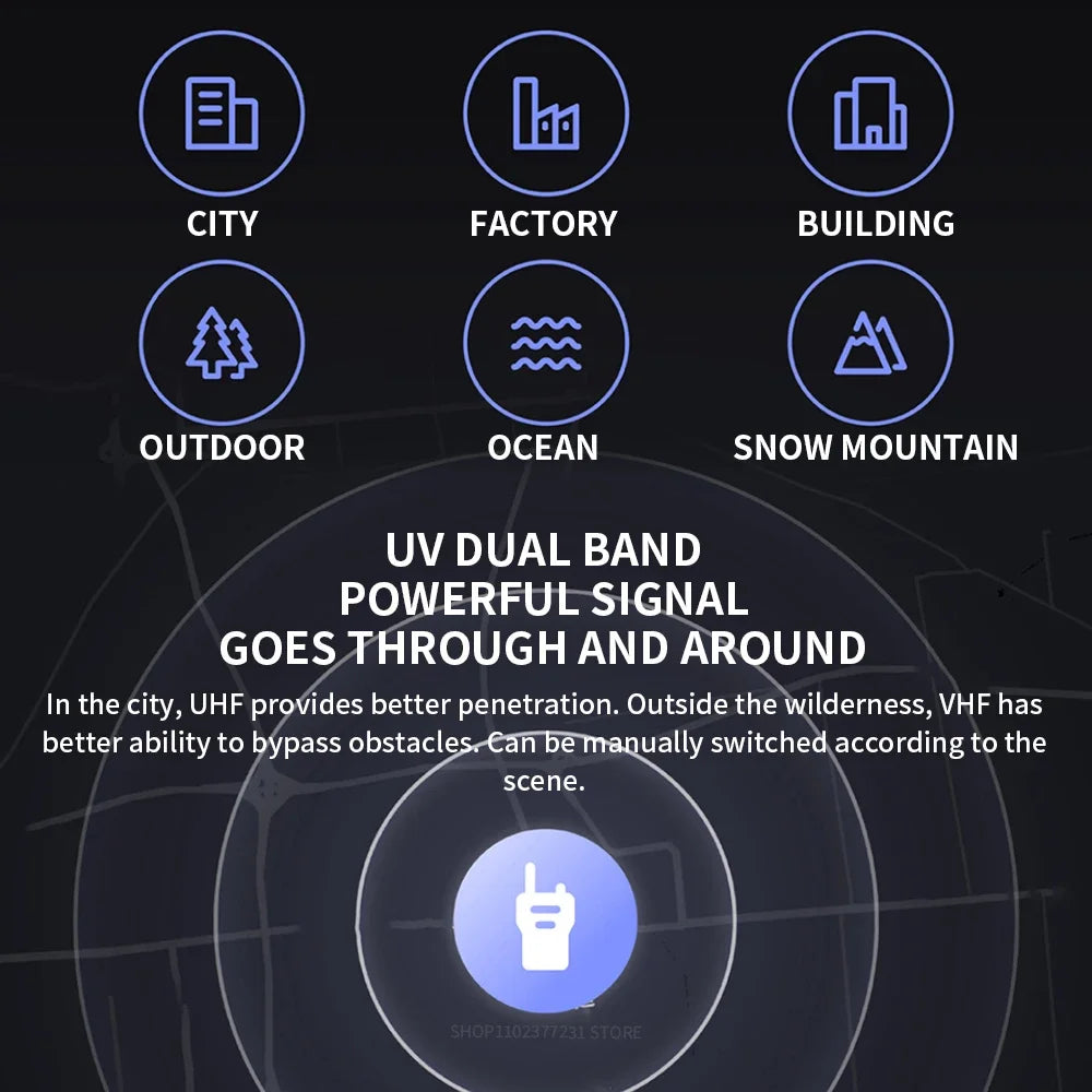 -In the city, UHF proides better penetration. Outside the wilderness, VHF has better ability to bypass obstacles,Can be manually switched according to the scene.