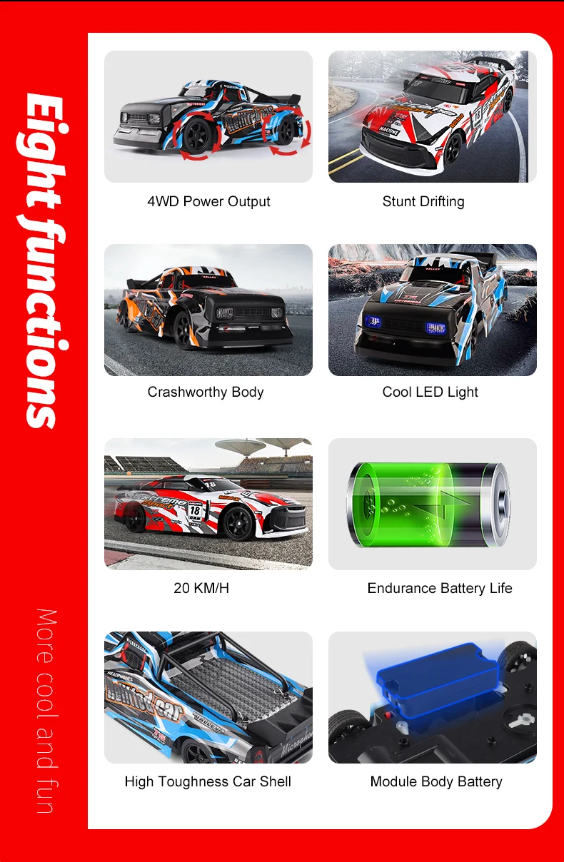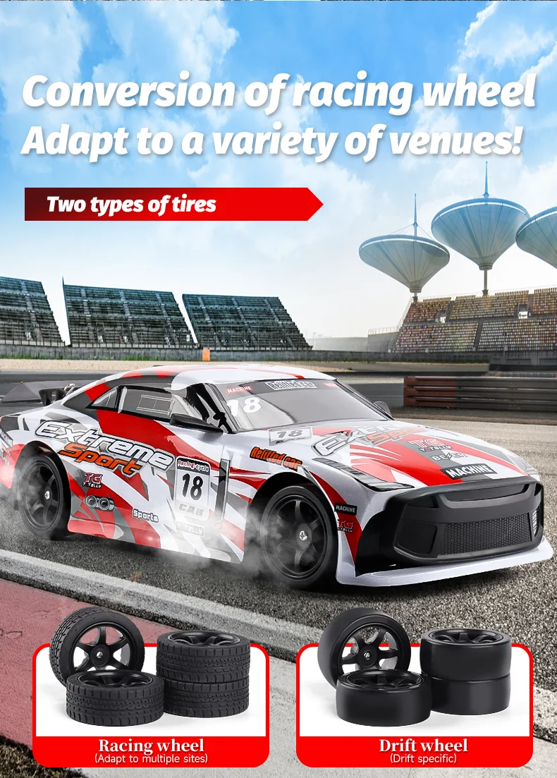 A multi-functional four-wheel drift racing car: This four-wheel remote control drift racing car is equipped with replaceable racing and drift tires, allowing you to easily switch between high-speed racing and drift competitions.