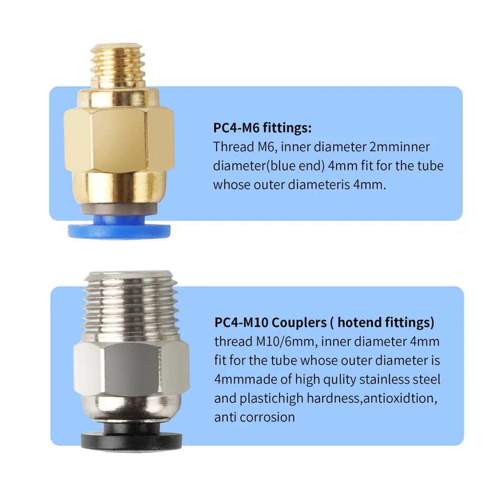 Easy to Install: the extruder fittings are PC4-M6 and the hotend fittings are PC4-M10, the upper part can be inserted outer diameter 4mm PTFE tube and self-locking.