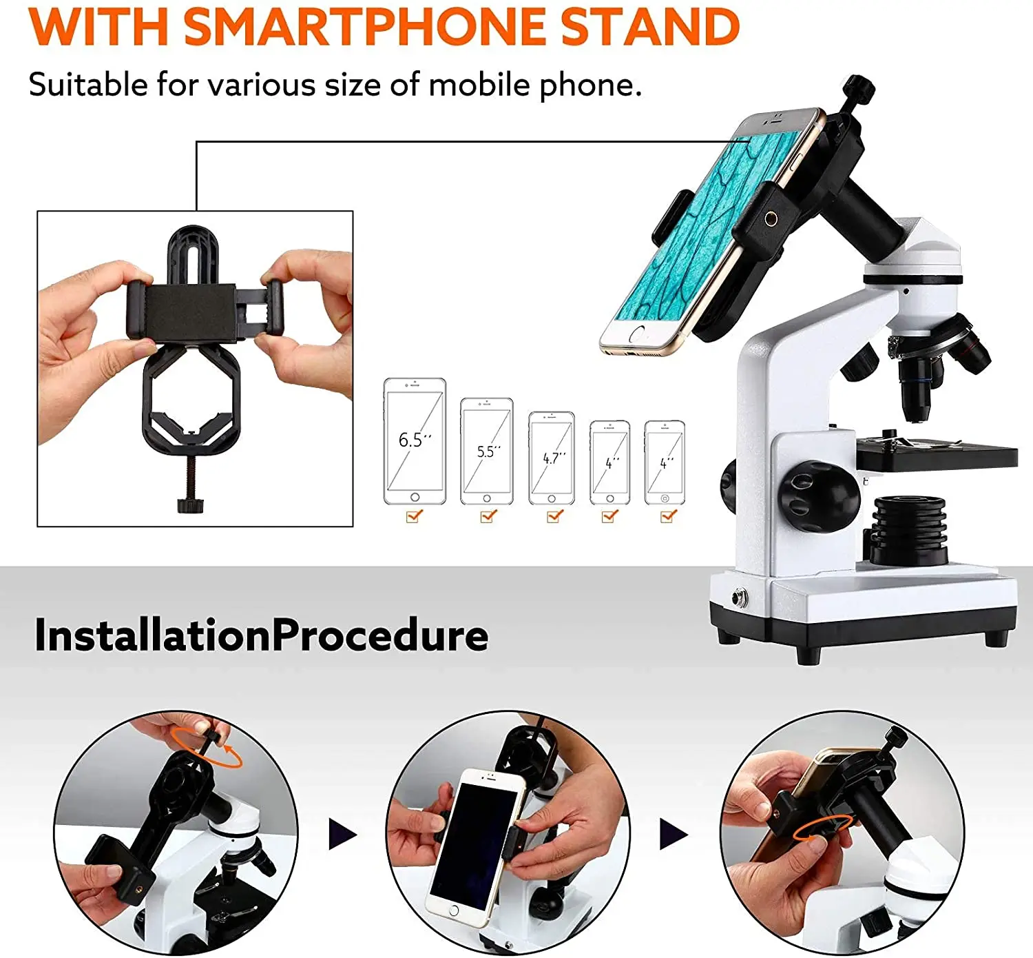 4.【With Smart Phone Stand】: The adjustable phone stand could help you to record the observation when you use the mobile phone camera to align the microscope eyepiece.