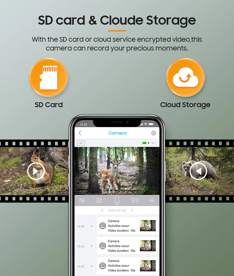 【Smart PIR Motion Detection Alerts】Game camera features built in intelligent algorithms and a PIR activated sensor which performs better and reduces false alarms. The Motion-activated alerts will be sent in real-time to your cell phone. Video and images can be stored in a microSD card (up to 128GB, NOT INCLUDE) or Cloud(new users get a 1-month free trial). You can even set the detection sensitivity, schedule, and area zones to avoid false alarms.