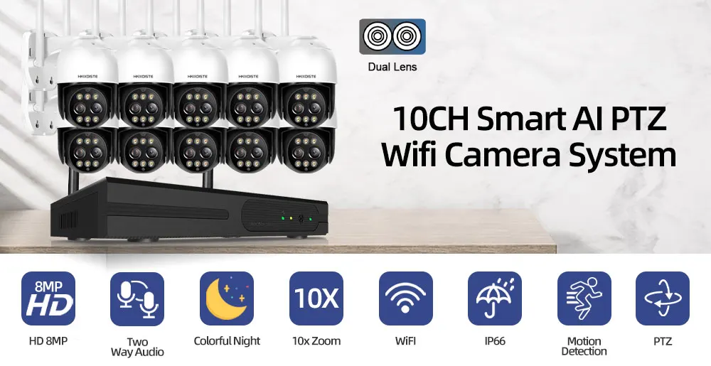 4K 8MP WiFi Security Camera System Kit Wireless CCTV System 10CH NVR Outdoor PTZ Two-Way Audio Video Surveillance Cameras P2P