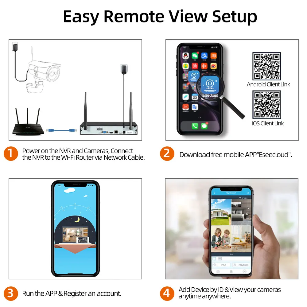 Easy setting , just 4 steps for mobile phone viewing,View live video of the system from anywhere and anytime via you smart phone, table or PC with advanced P2P technology, you are able to remote access your system in minutes or less, no portforwarding needed, remote access has never been so easy!!!