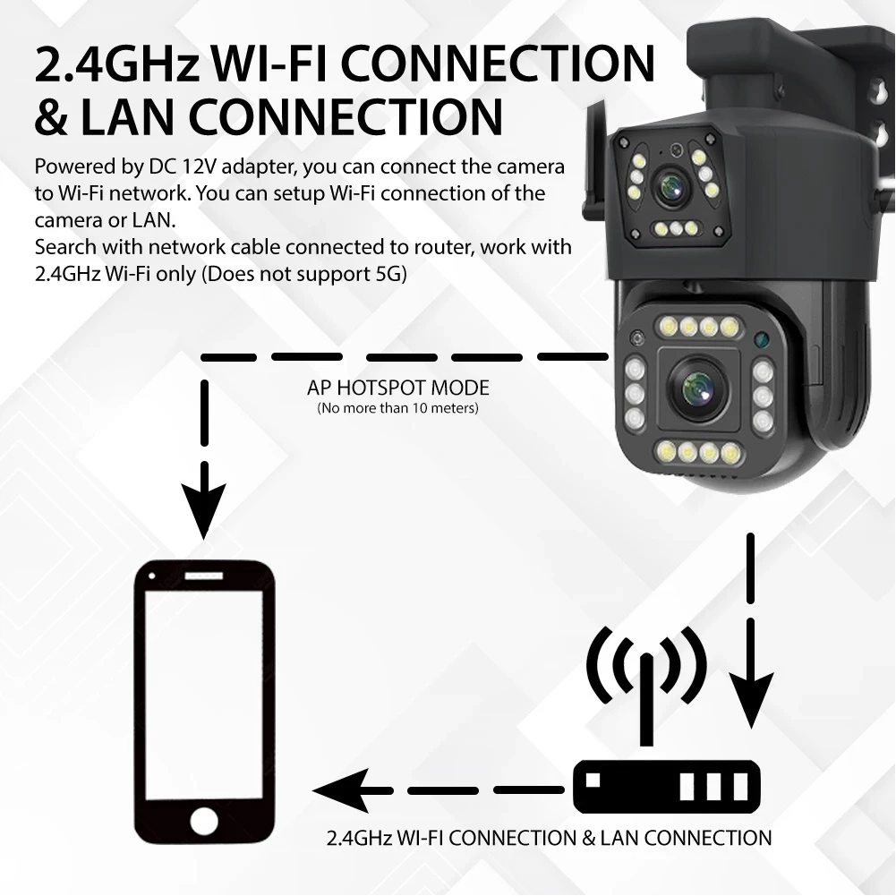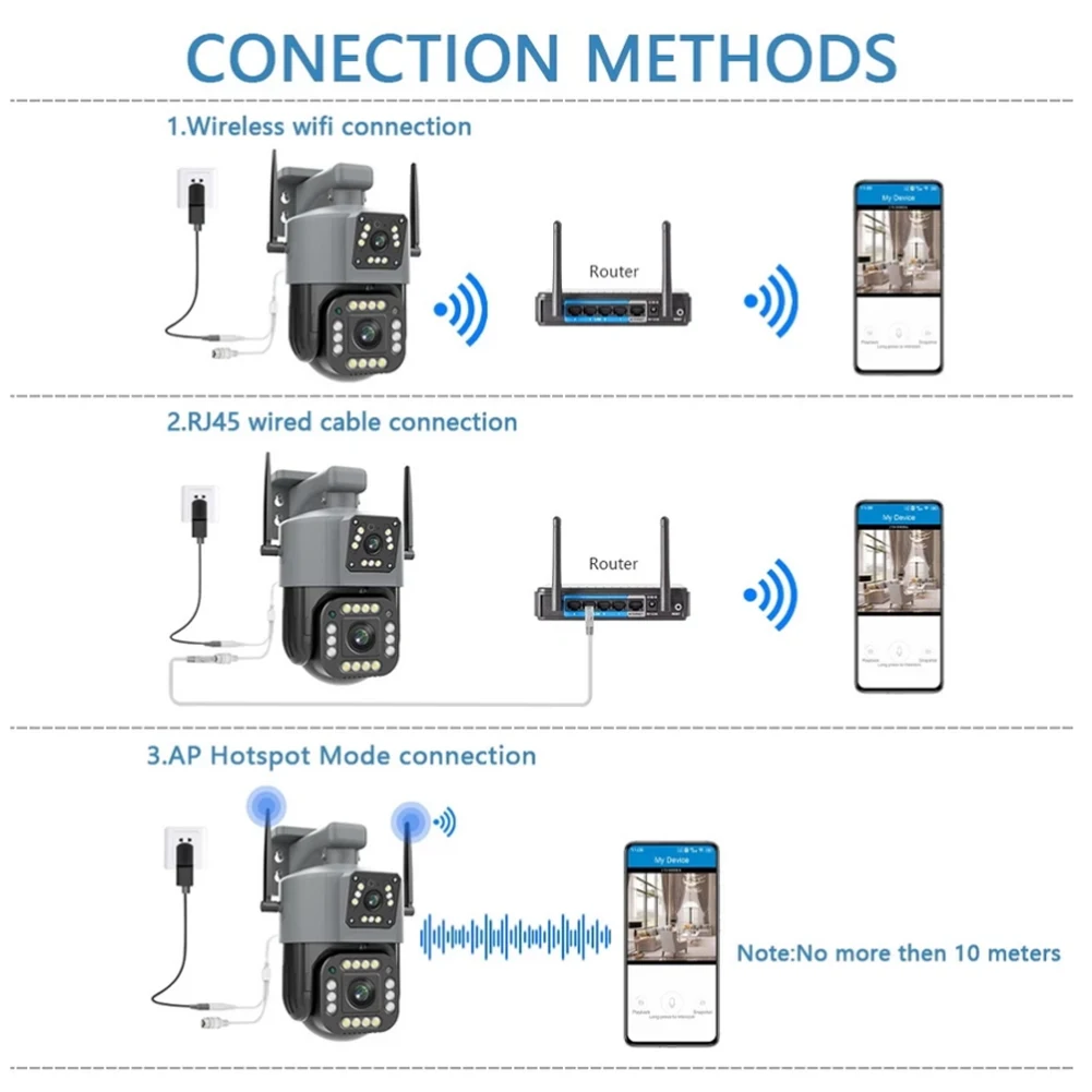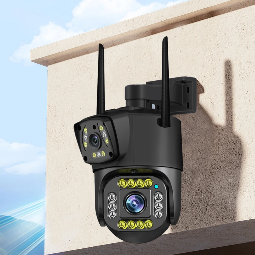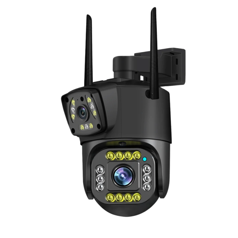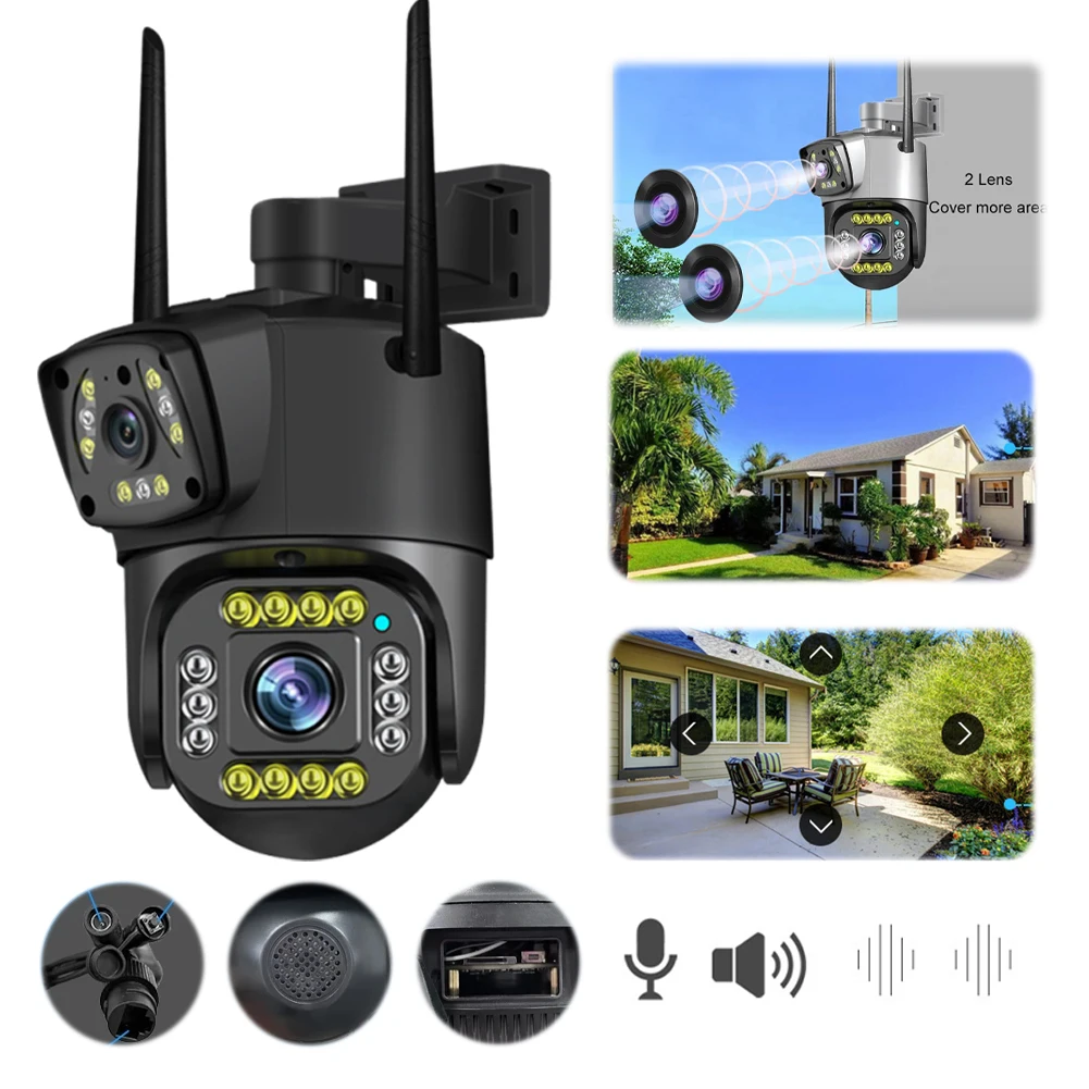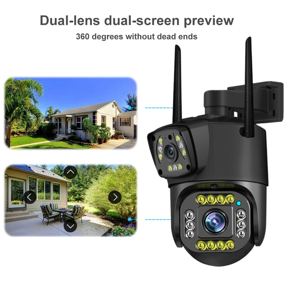 1. Superior Night Vision: The dual lens security camera offers ultra-high-definition resolution with a fixed wide-angle lens and a 360° coverage lens, ensuring no blind spots. It provides exceptional daytime clarity and advanced full-color night vision, capturing more details in darkness up to 30 feet away. Specification: Origin: Mainland China Material: ABS+PC Color: Black Input voltage: AC 100-240V Frequency: 50 - 60HZ Tilt angle: 355°/120° Motion track: Supported Wireless connection: Supported Automatic circle recording: Yes Android / IOS / PC: Compatible Two-way audio: Yes Resolution: 1080P Wi-Fi: 2.4ghz frequency Main control chip: AKV400W Video format: PAL / NTSC (H.264) Lens focal length: 4mm Image sensor: CMOS 1/3 (inch) Number of lenses: 2 Pixels: 2 million * 2 Image code: JPEG Video resolution: 1280 * 960 Video frame rate: 25 frames/second Supported card slot: TF card (minimum support 16G, maximum support 128G, the product does not include a memory card) Video control: support Reminder action: ring alarm/mobile phone APP push Playback: support remote playback Minimum illumination: 0.1 (lux) Wireless standard: WiFi 802.11b/g/n Infrared light irradiation distance: 10 meters Waterproof level: IP66 Working temperature: 0-40℃