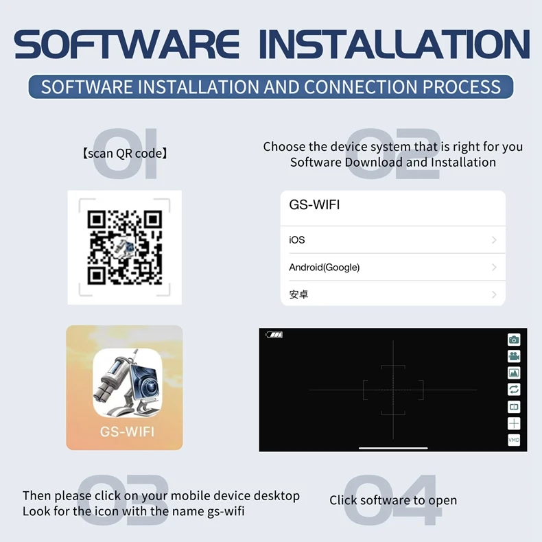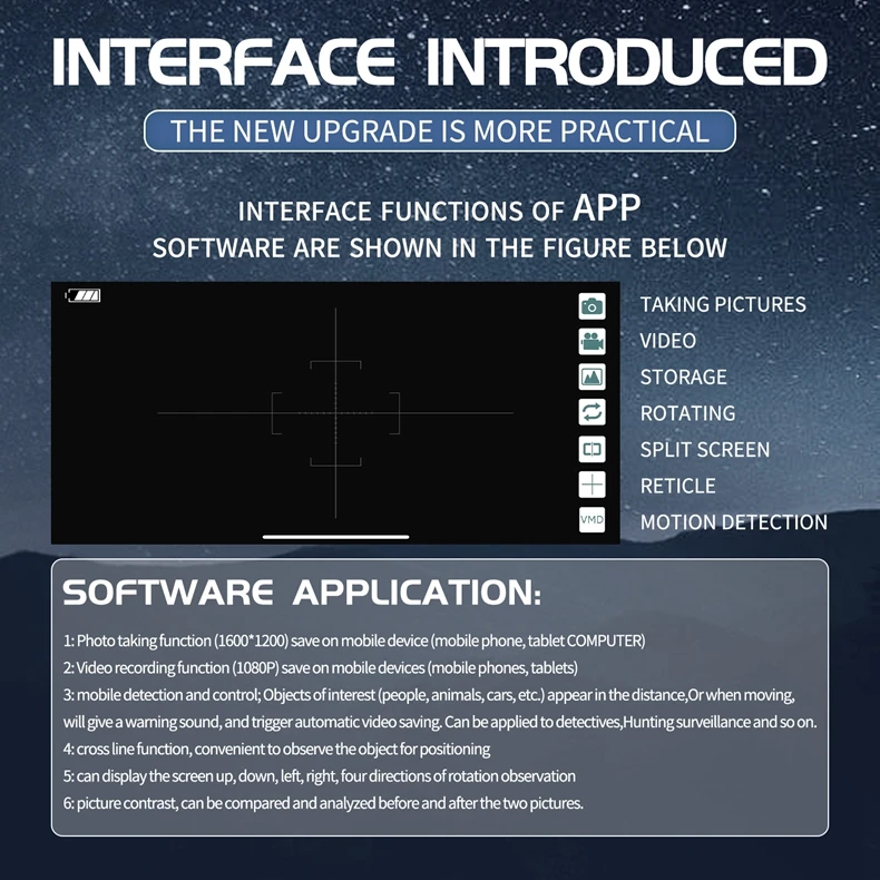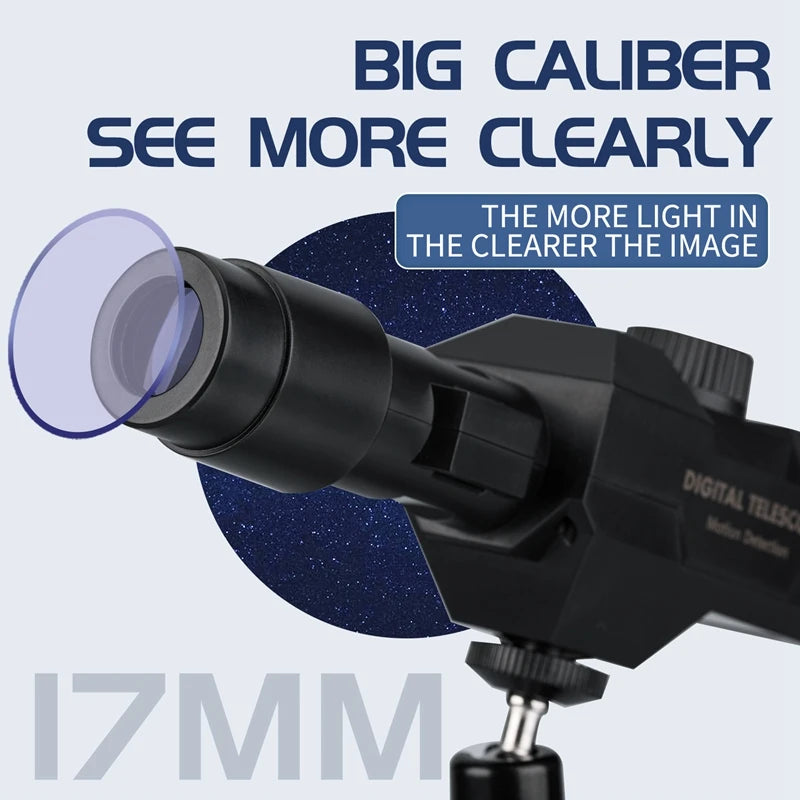 This telescope has a large objective lens, the larger the objective lens caliber, the more light enters the images, the sharper the images, the clearer the view, and the richer the detail seen. The mobilephone APP control is available for both Android and IOS systems, and supports photo-taking, video recording, motion detection and control, crosshairs localization, four-way observation, and screen comparison functions. It comes with a telescopic tripod, transfer orientation, and the stand that can be removed.