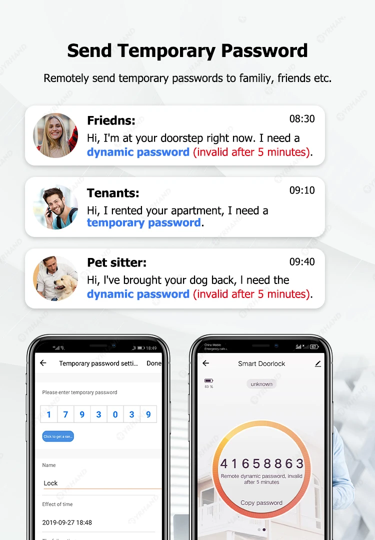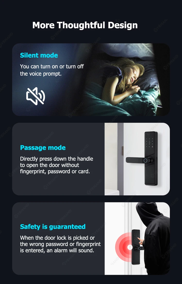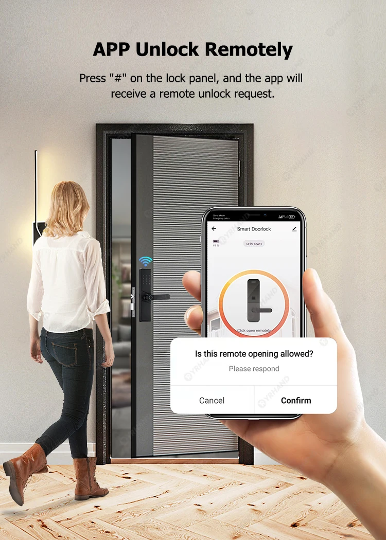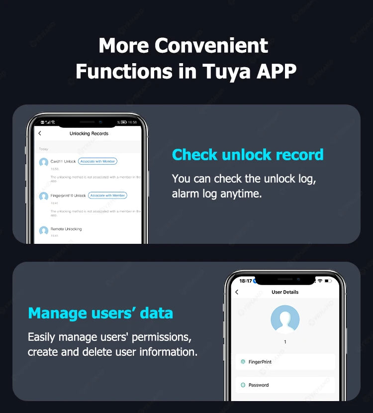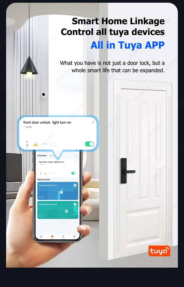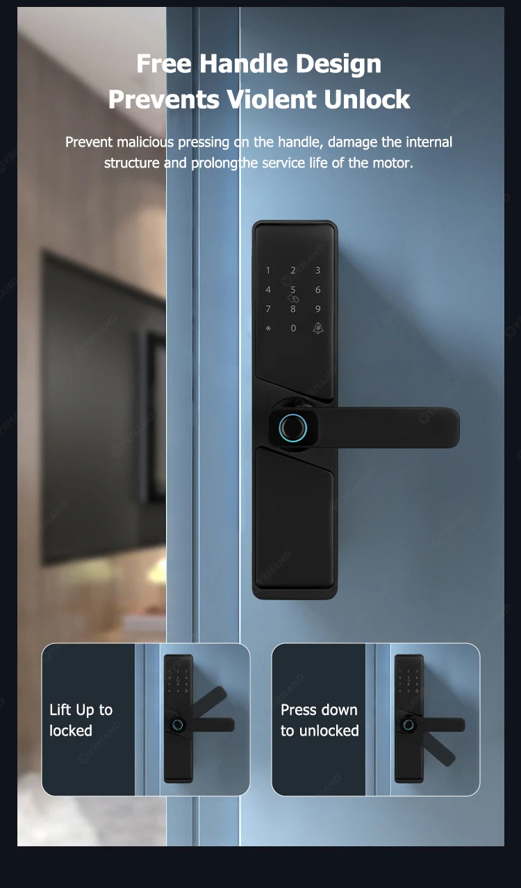 5 unlock methods: Tuya APP/ Fingerprint / Password / Smart Card / Key/Wrist strap Unlock