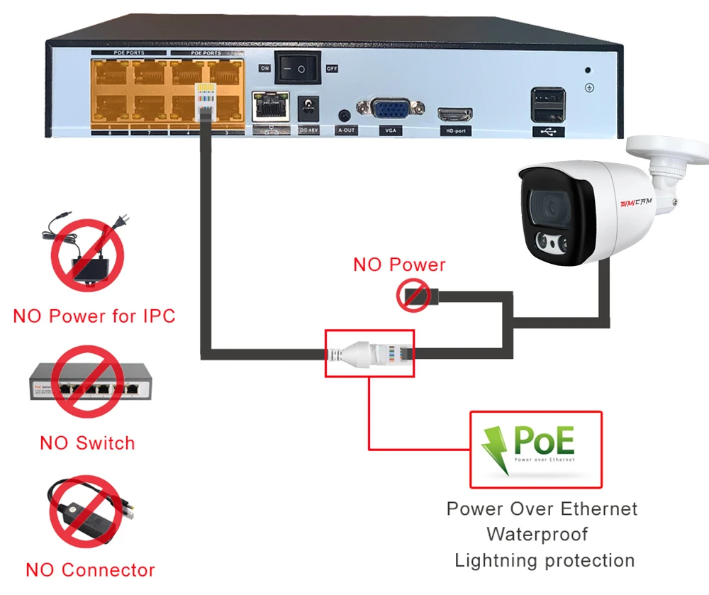 A real play and plug security! It features POE (Power over Ethernet), with a single cable connecting each IP camera to the NVR for both power supply and video and single transmission. Easy wiring - the wiring process can't be simpler for DIY enthusiasts and beginners