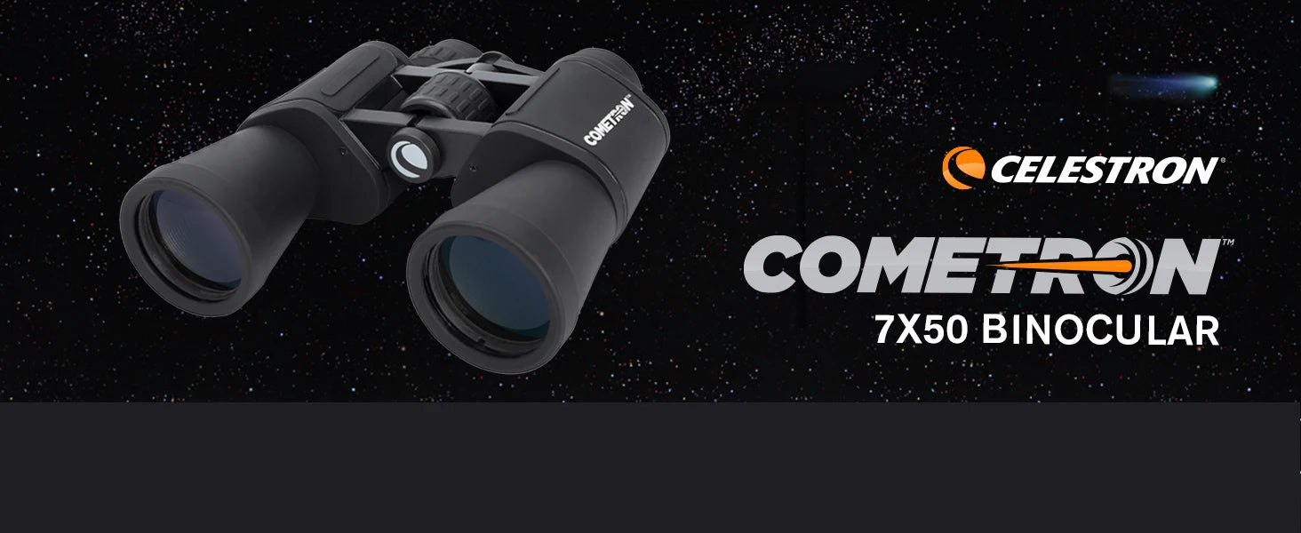 Get ready for the next awe-inspiring comet with a pair of sleek, portable Celestron Cometron 7x50 binoculars. The large 50 mm objective lenses and multi-coated optics offer amazing light-gathering capabilities that bring celestial objects into bright, sharp focus, making them ideal for comet watching, stargazing, and viewing craters on the Moon. Cometron 7x50’s wide field of view lets you explore expansive swaths of the sky to quickly pinpoint exactly the object you want to see, then keeps it in your sights without constant movement. Cometron 7x50’s rubberized aluminum housing is durable, lightweight, and tripod adaptable for extended comfort during long stargazing sessions. The binoculars come with a wide neck strap and a carrying case for security, portability, and grab-and-go convenience. Nitrogen Filled: No. Carrying Case: Woven Nylon