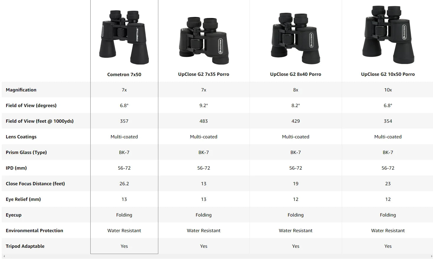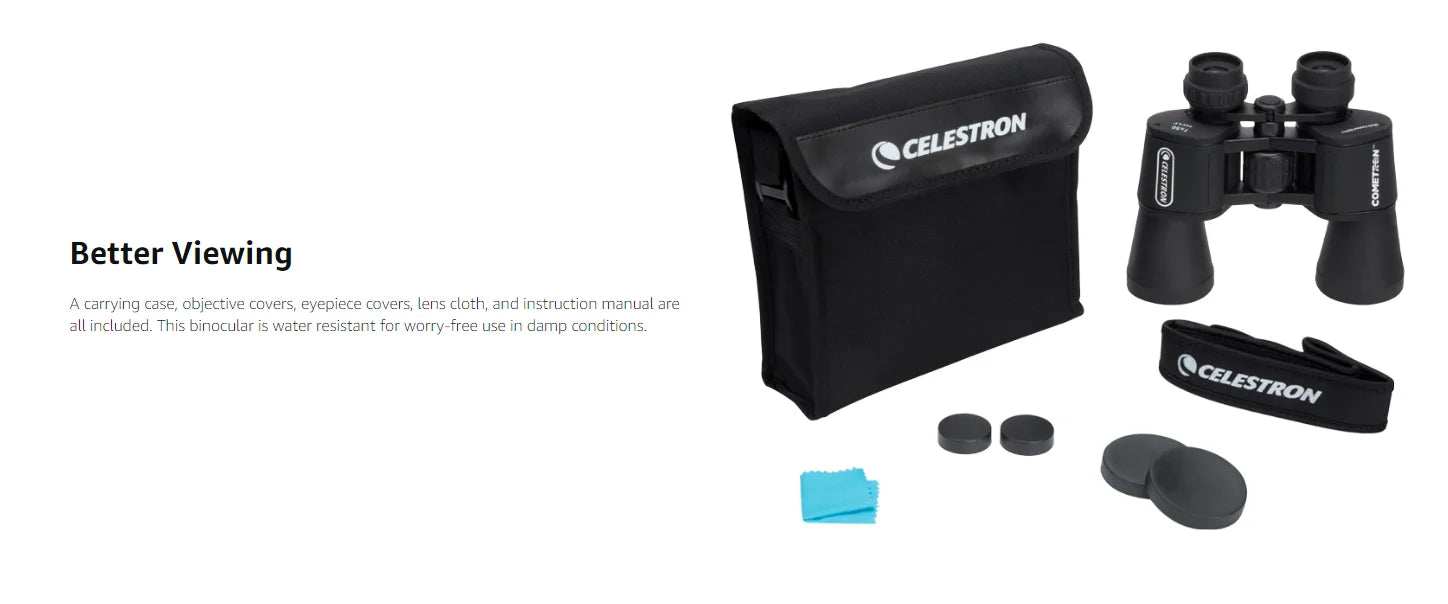 Wide field of view reveals a larger portion of the night sky, allowing you to view more of the comet's impressive tail ^Large 50mm objective lenses have tremendous light-gathering ability, ideal for astronomical use ^Multi-coated optics dramatically increase light transmission for brighter images with increased contrast and resolution ^Large exit pupil provides maximum light during nighttime and low-light viewing sessions ^Strong and durable alumnium housing