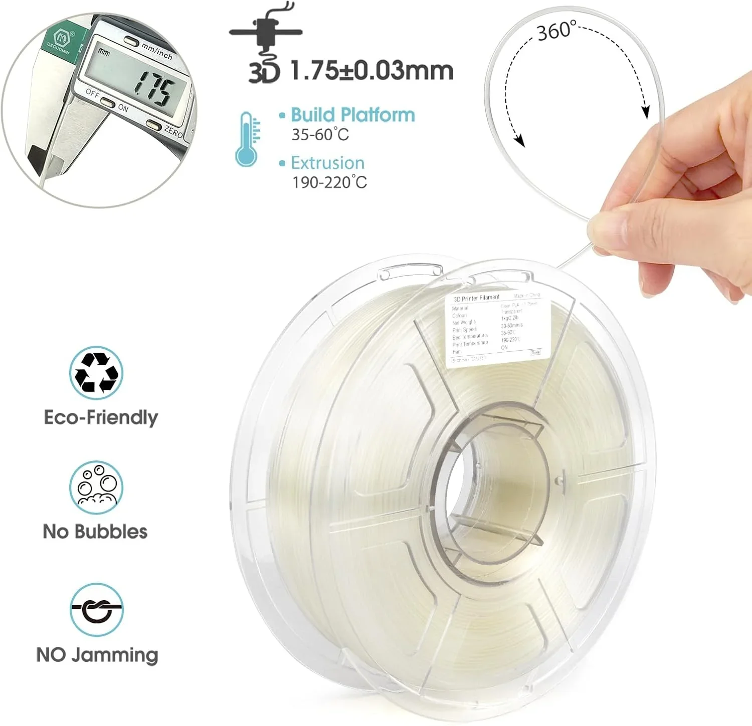 ✨【Recommended Printing Settings】The recommended printing speed of this transparent filament is 30-600mm/s, the printing temperature: 230℃-260℃, the hot bed temperature: 60℃-70℃, Dimensional: 1.75mm, Accuracy +/- 0.02mm, Nozzle : 0.4mm.