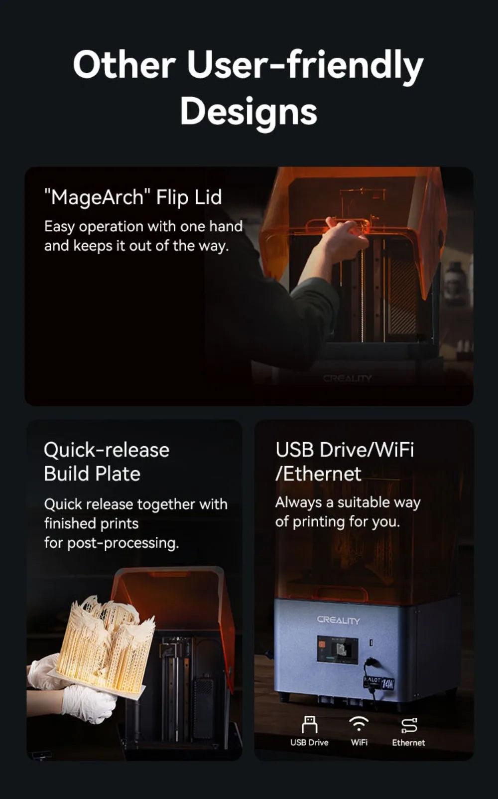 The latest HALOT OS enables easy remote printing from a phone or PC.With network, it can directly download sliced model files from the built-in Creality Cloud personal model library, Now, printing is beyond the limits of time, space and device.