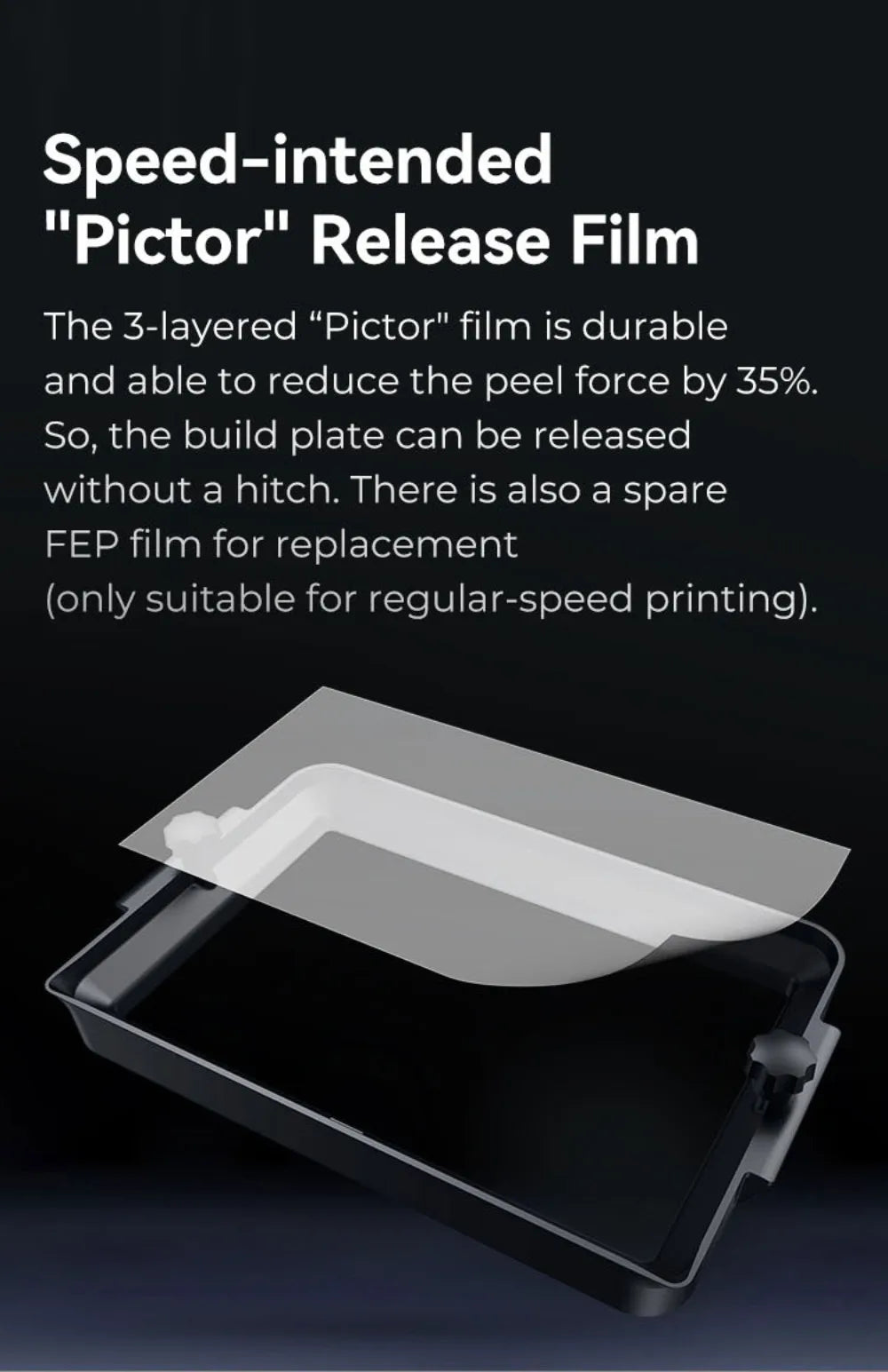 The 3-layered "Pictor" film is durable and able to reduce the peel force by 35%.So, the build plate can be released without a hitch.There is also a spare FEP film for replacement (only suitable for regular-speed printing).
