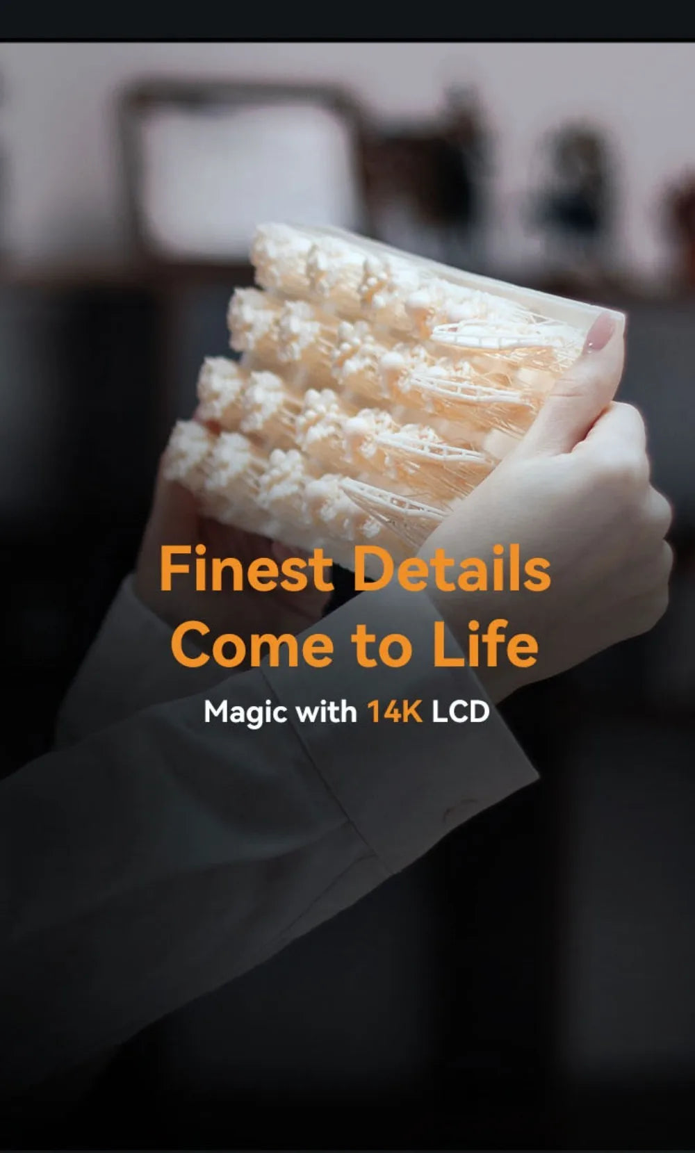 HALOT-MAGE S features a premium LCD screen with 14K ultra-high resolution.It has the magic to render shapes, textures and fabrics exactly as designed.Each 3D print represents a true-to-life art piece.