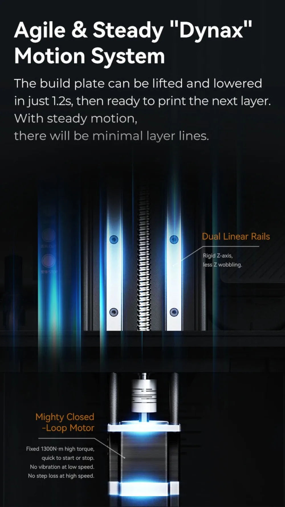 The build plate can be lifted and lowered in just 1.2s, then ready to print the next layer. With steady motion, there will be minimal layer lines.