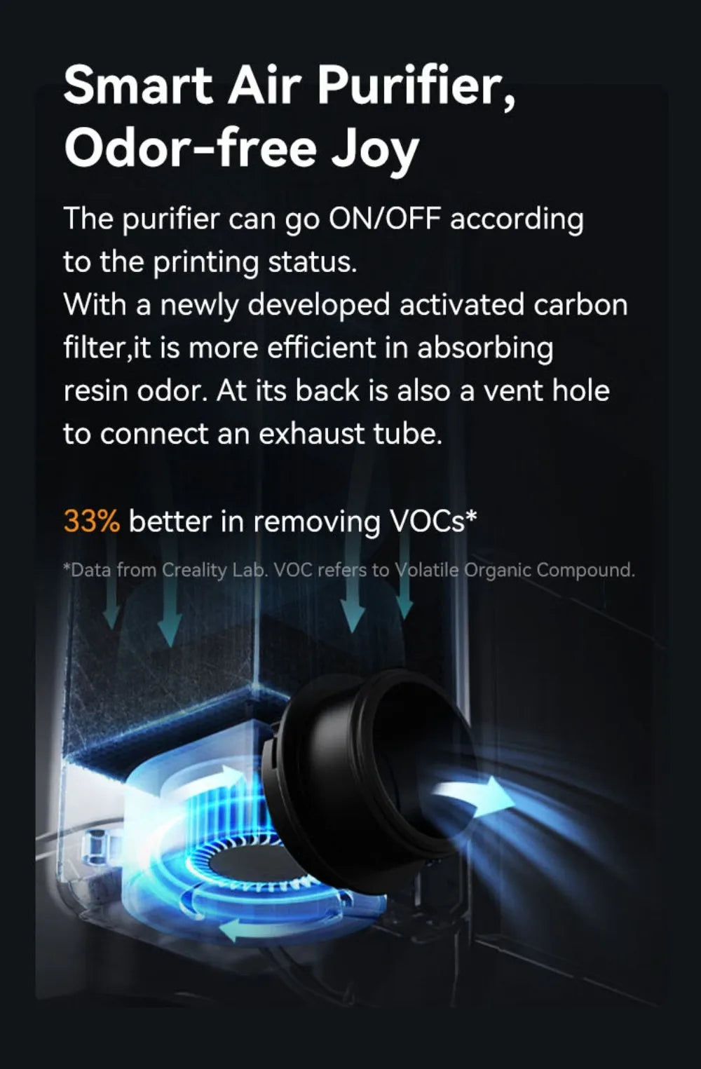 The purifier can go ON/OFF according to the printing status.With a newly developed activated carbon filter, it is more efficient in absorbing resin odor. At its back is also a vent hole to connect an exhaust tube.