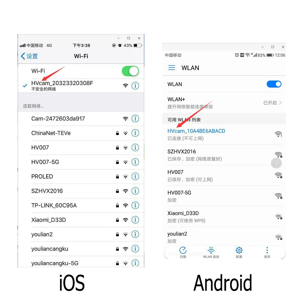 Open the Wifi settings of the iOS / Android device, open the Wifi, find a Wifi hotspot prefixed with HVcam-xxx and click Connect (no encryption). After successful connection, return to the main interface of the iOS / Android device.