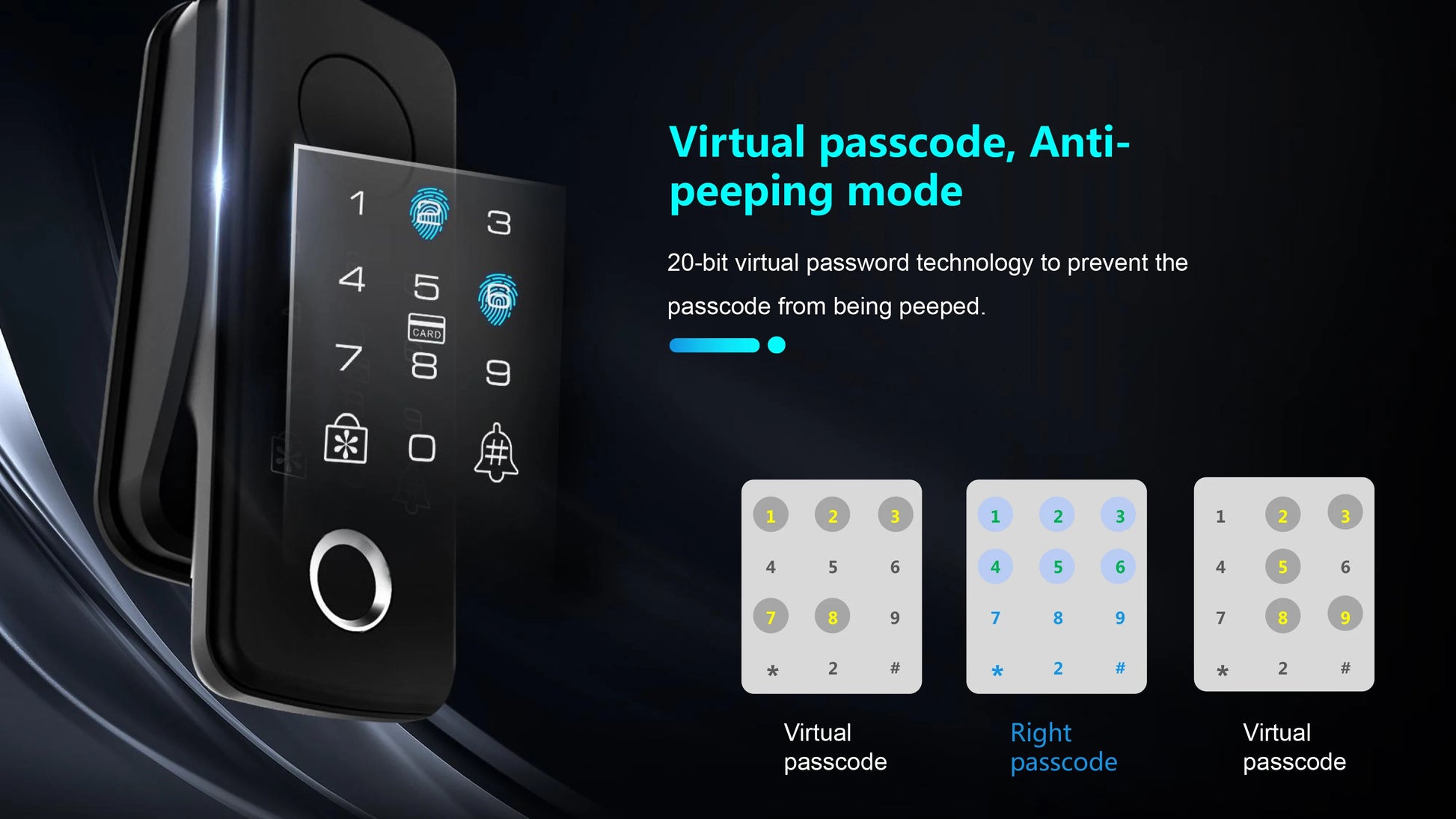 20-bit virtual password technology to prevent the passcode from being peeped.