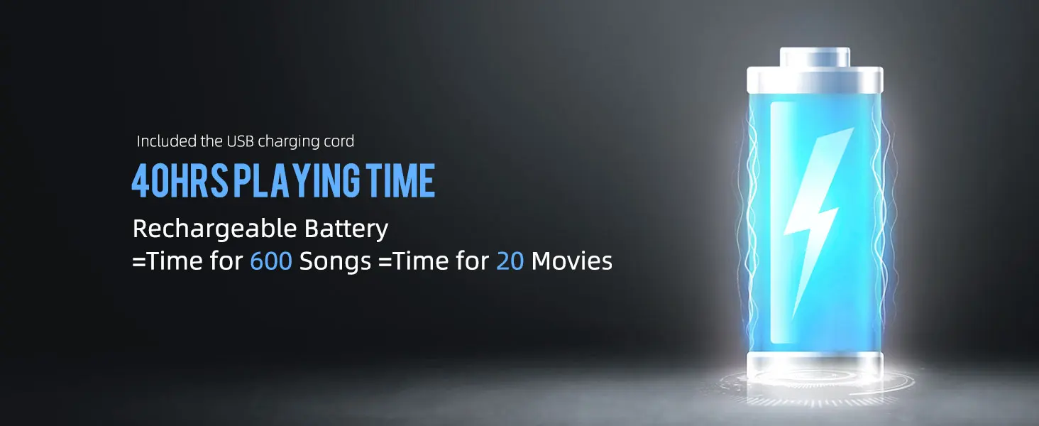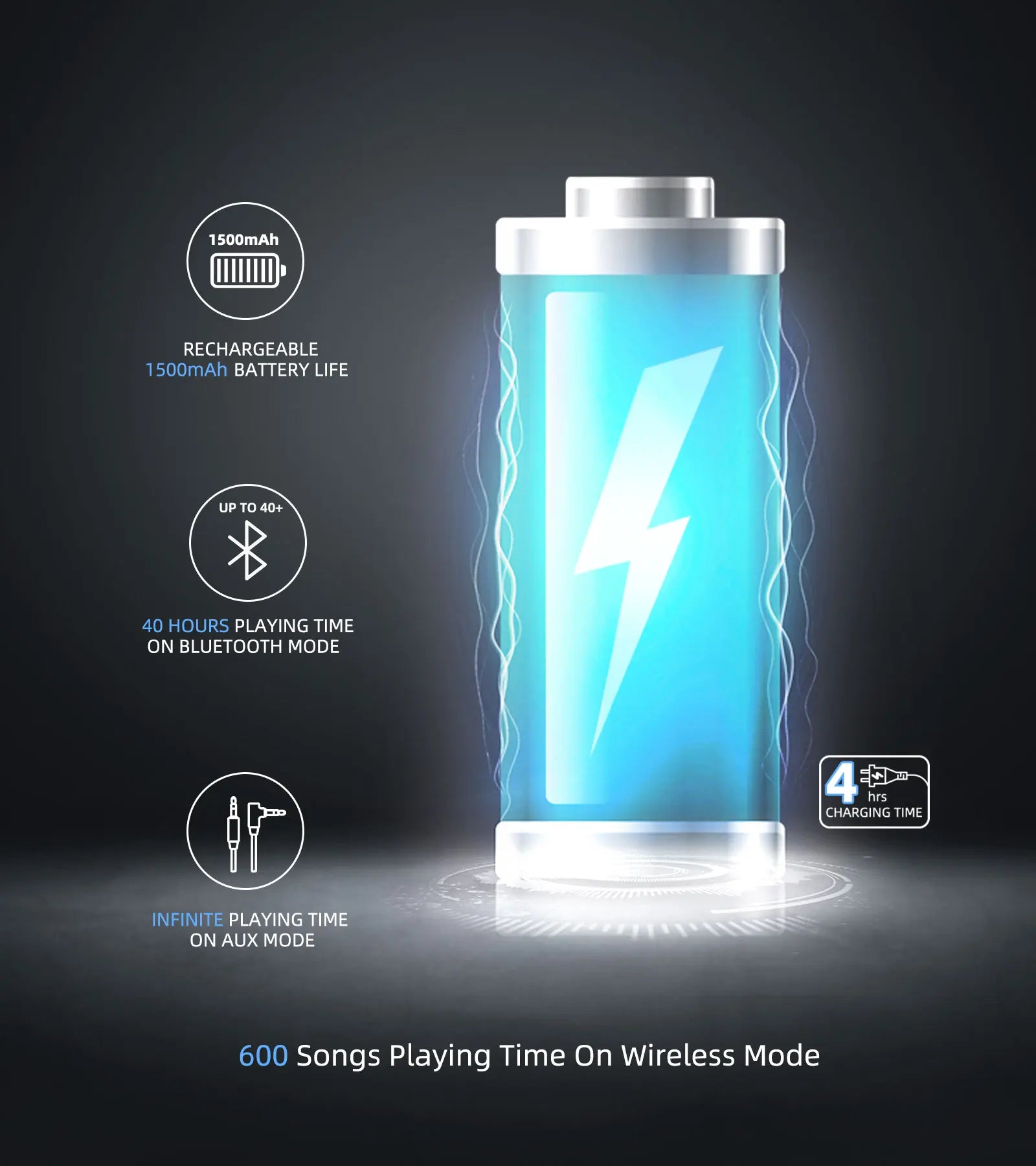 3.Built-in 1500 mAh Rechargeable Battery - Large capacity battery allows you to play up to 600 songs for 40 hours of uninterrupted use. The rechargeable battery also saves money. Unlimited play time with AUX audio cable connect to your devices