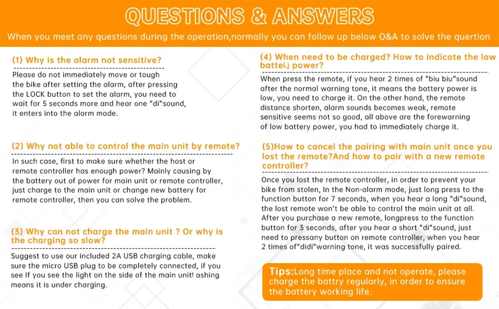 ●Battery Information & Battery Replacement Method: Bicycle alarm host inside of the bicycle anti-theft alarm is a 400mAh (3.7V) battery, please use original 2A USB charging cable to connect the adapter to charge the bicycle alarm, generally it can be fully charged in 3 hours . Wireless remote : 12V/27A, the remote control distance is about 30-50M. If the remote can't control the host, please replace the battery and then re-match the alarm panel with the remote.