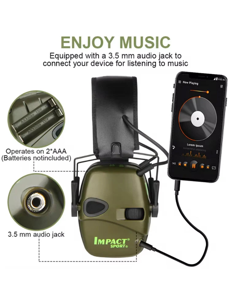 An external audio jack lets the earmuff do double duty as stereo headphones when connected to an MP3 player or other audio source.