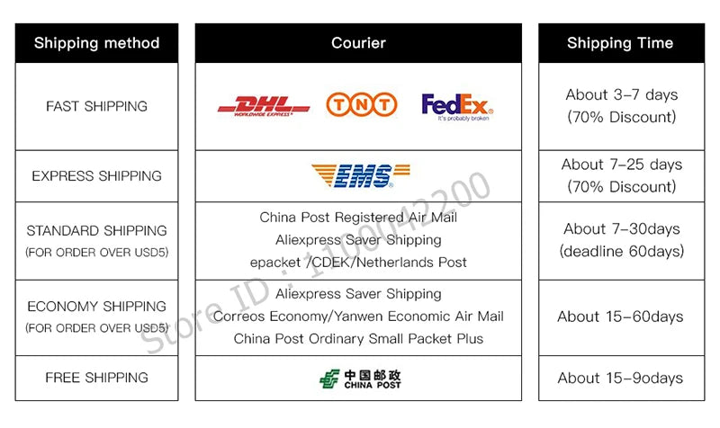 Standard shipping time for the countries covered by our delivery partners are presented below. You can find them when choosing for a delivery method before confirming your order:
