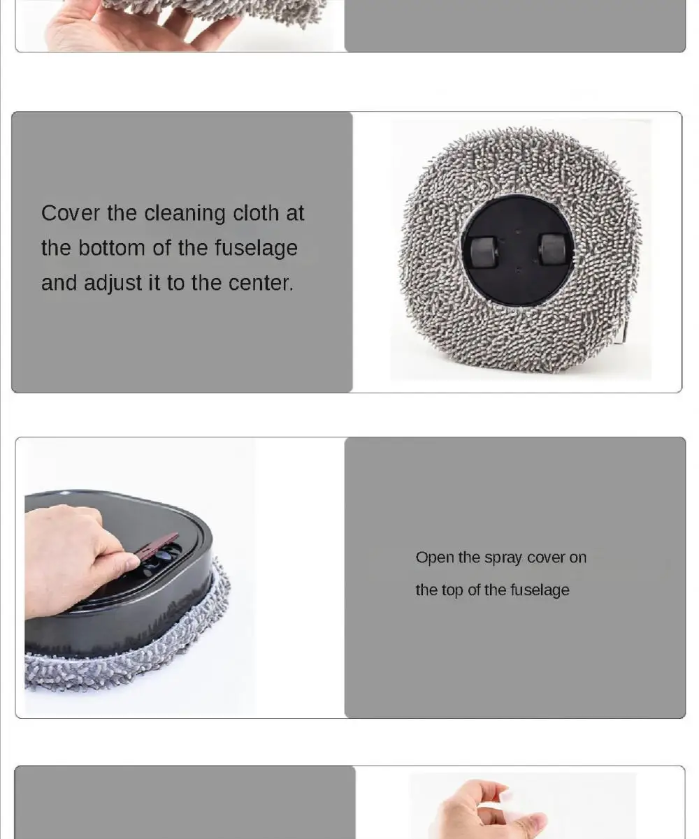 9. Instructions for use: Turn on the side switch; Wet and wring the cleaning cloth dry; Cover the cleaning cloth at the bottom of the machine body and adjust it to the center; Open the spray cover on the top of the fuselage; Use a water dispenser to add proper amount of water to the spray nozzle; Gently press to automatically clean.