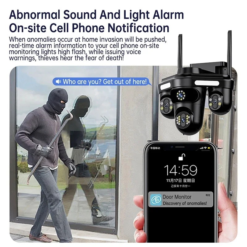 * Abnormal sound and light alarm: When an abnormal intrusion occurs at home, the real-time alarm information will be pushed to your mobile phone. The on-site monitoring lights flash high, and voice warnings are issued at the same time to drive away thieves.