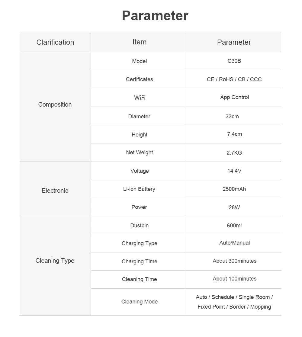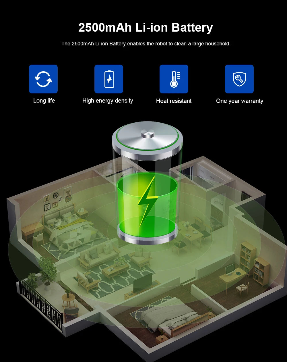 6. Electric control water tank ensures even water seepage. The water seepage stops automatically if robot stops working. The huge water volume of 350ml ensures continous wet mopping up to 100 minutes.