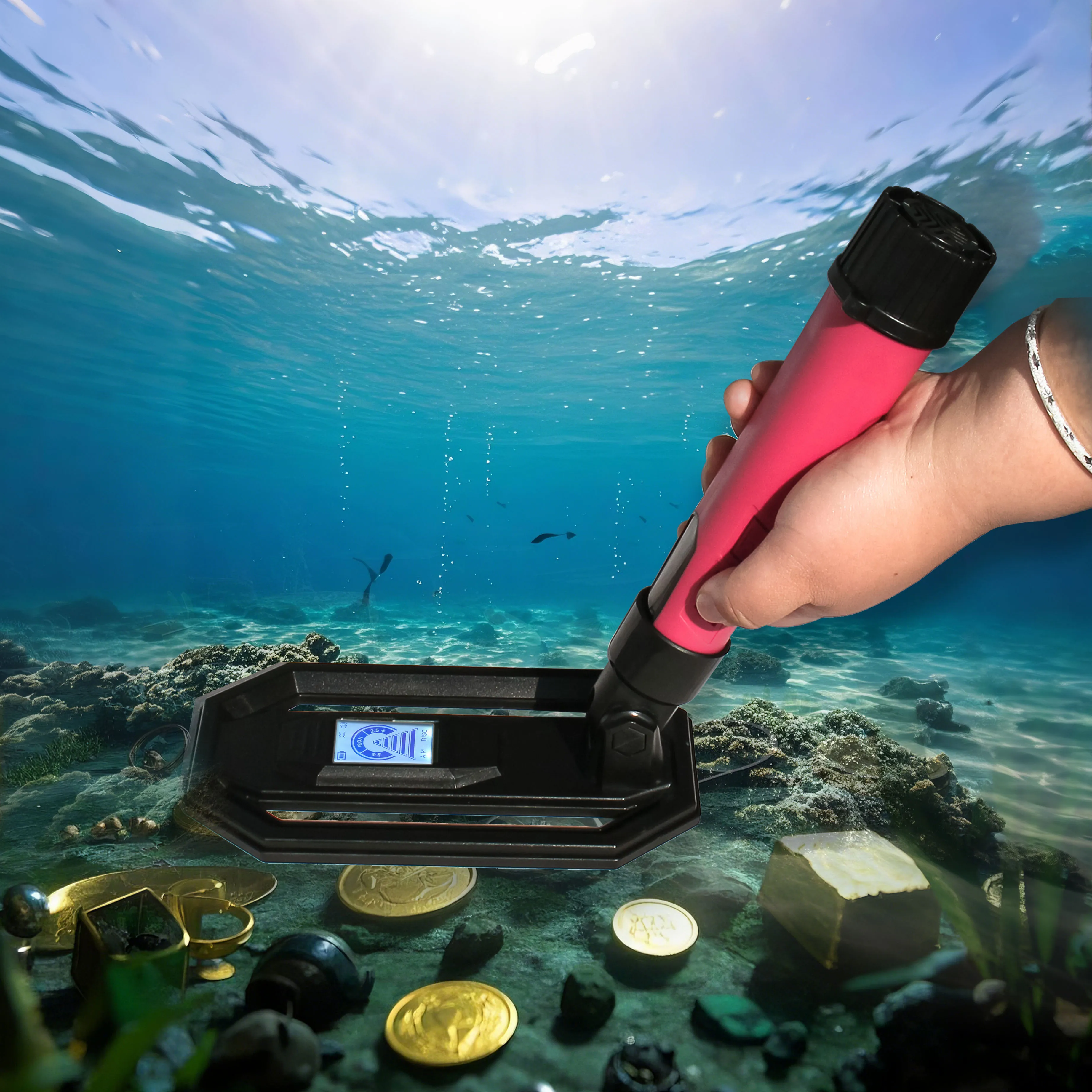 This product is fully waterproof up to 5 meters into water, can recognize metals, is rechargeable with lithium batteries, and can be folded.