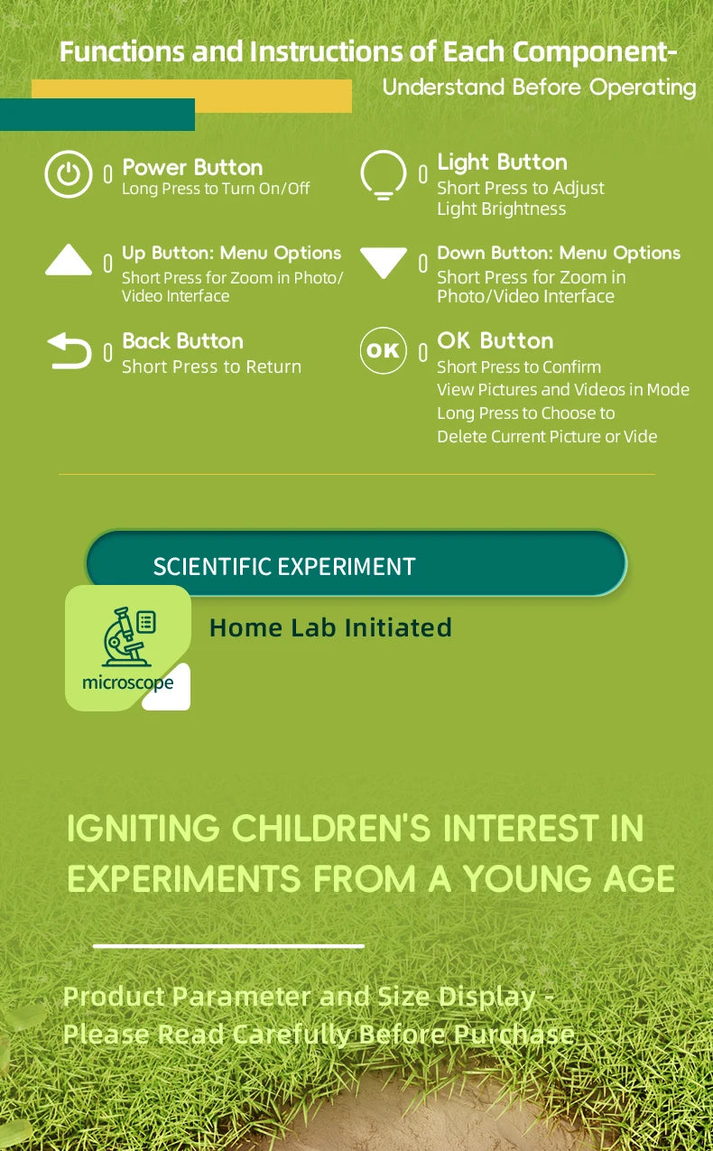 Features: 4.0 HD color screen, photo taking, video recording, magnification 100-1600x, roller focus, 3-speed lighting, settings, view photos/videos, timed photo taking, loop recording, volume adjustment, screen protector, rotatable/detachable screen, 3-in-1 assembly and disassembly mode