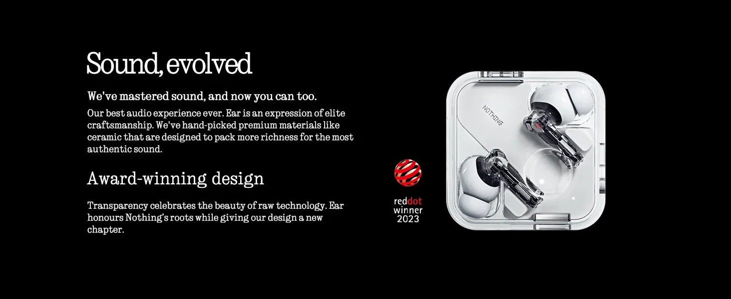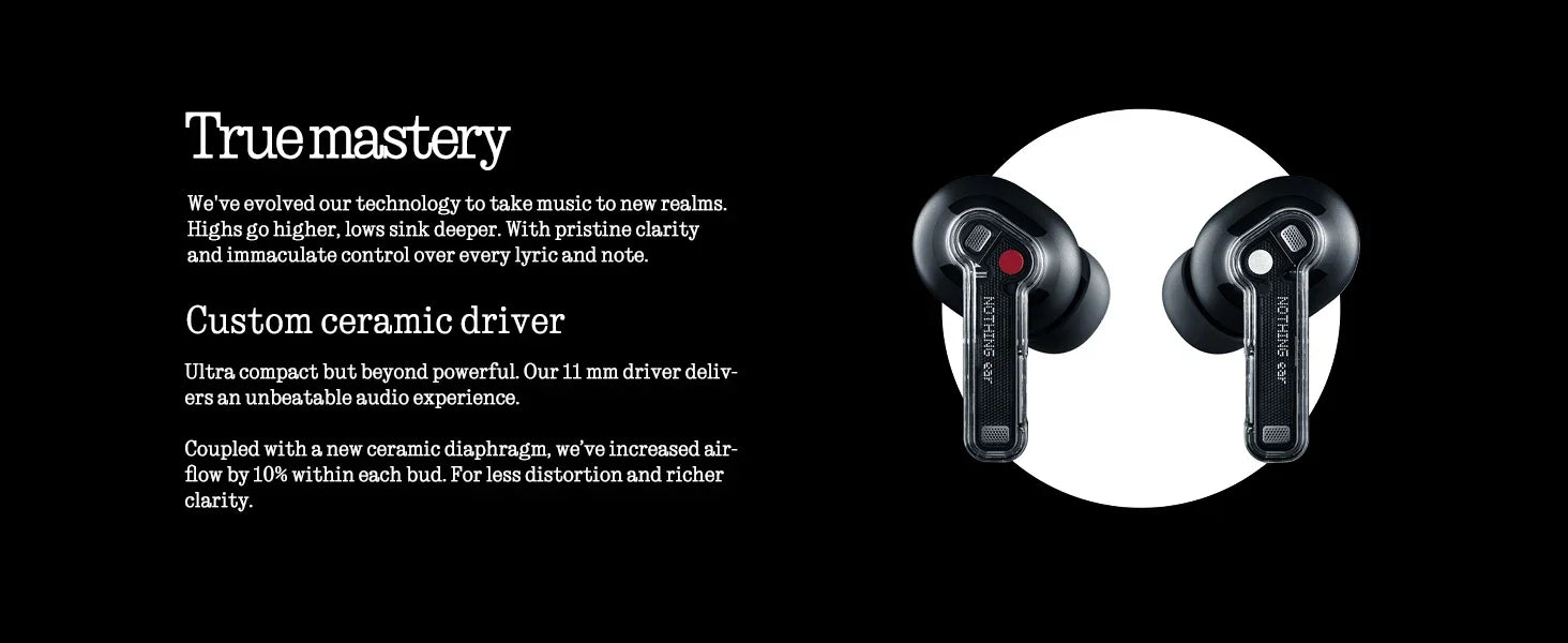 Custom Ceramic Driver: Nothing Ear ultra compact but beyond powerful. Our 11 mm driver delivers an unbeatable audio experience.Coupled with a new ceramic diaphragm, we've increased airflow by 10% within each bud. For less distortion and richer clarity