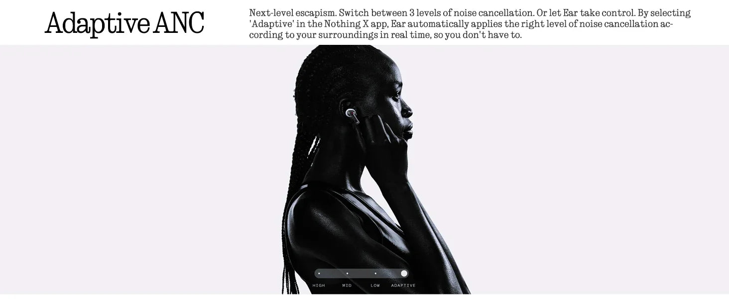 Smart Noise Cancelling: Nothing but the music. Nothing ear wireless earbuds with up to 45 dB Active Noise Cancellation, Ear features our most effective and intelligent noise cancelling powers yet. Now 1.8x stronger than Ear (2). Ear automatically checks for noise leakage between the earbud and your ear canal, then applies more noise cancellation to make up for it. So you receive the best possible noise cancellation