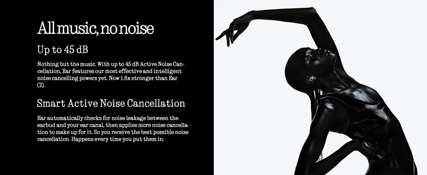 Smart Noise Cancelling: Nothing but the music. Nothing ear wireless earbuds with up to 45 dB Active Noise Cancellation, Ear features our most effective and intelligent noise cancelling powers yet. Now 1.8x stronger than Ear (2). Ear automatically checks for noise leakage between the earbud and your ear canal, then applies more noise cancellation to make up for it. So you receive the best possible noise cancellation