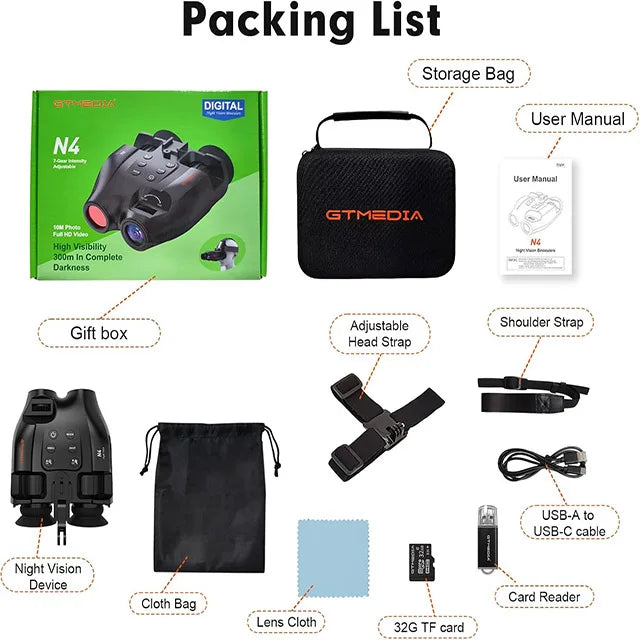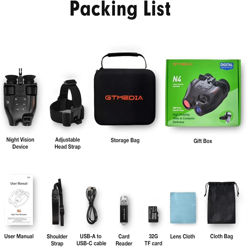 Night vision binoculars N4, the night vision distance is about 300 meters in complete darkness, 850nm infrared LED, 7-level brightness adjustable, can shoot 1080P high-definition video, with 5x digital zoom function, can be used outdoors day and night