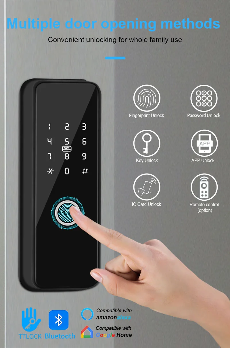 1.Advanced 6-in-1 Keyless Entry Smart Door Lock:Smart phone+Fingerprint + Code + Card + Key +(Remote Control);