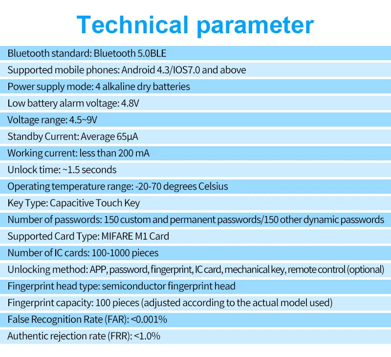 Ways To Unlock: App,REMOTE CONTROL,Bluetooth,Mechanical Keys,Finger Vein Recognition,Card,Password,FINGERPRINT