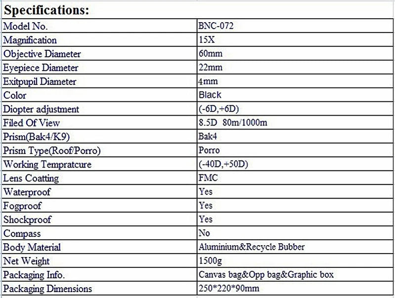 Model Number: 8X30,10X40,12X45,15X60,10X50,20X50