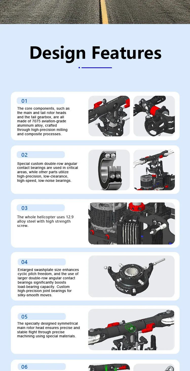 1.The core components,such asthe main and tail rotor heads and the tail gearbox,are all made of 7075 aviation-grade aluminum alloy,crafted through high-precision milling and composite processes.