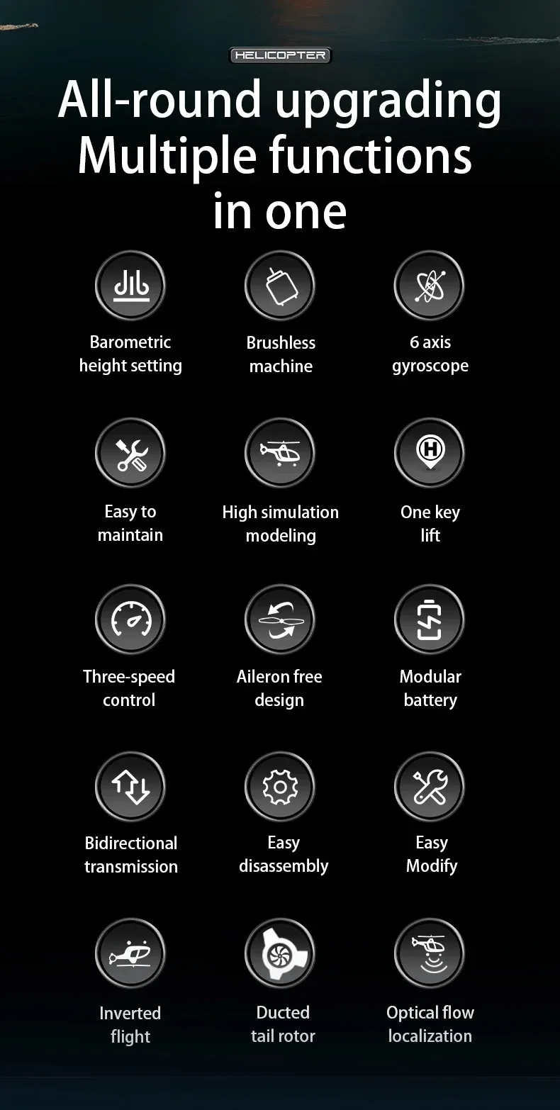 Productfunction:Aileron free design,dual brushless motor, pressure setting,modular battery,One touch lift,up,down, forward,backward,leftfly,right fly,left spin,Right rotation, route flight,pan brush stunt,6G mode,low voltage alarm, blocked rotation protection,Out-of-control protection, large and small volume conversion,optical flow positioning, one-click reverse flight