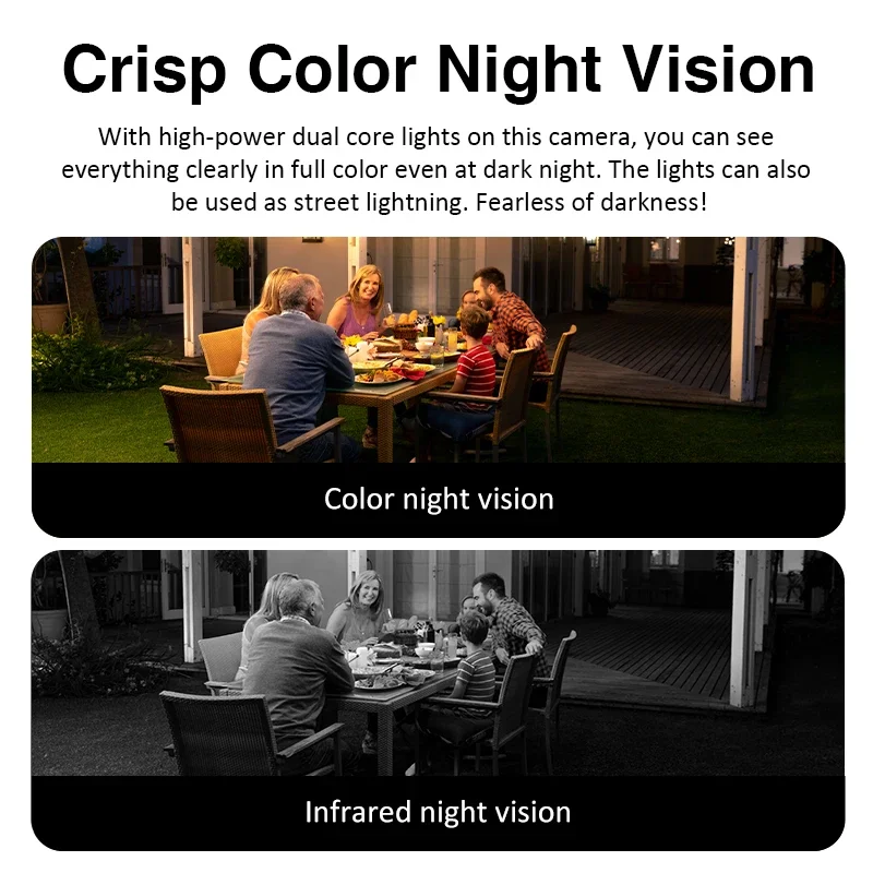 3. Dual light source design, built-in infrared light + white light, night vision infrared and night vision full color can be set;