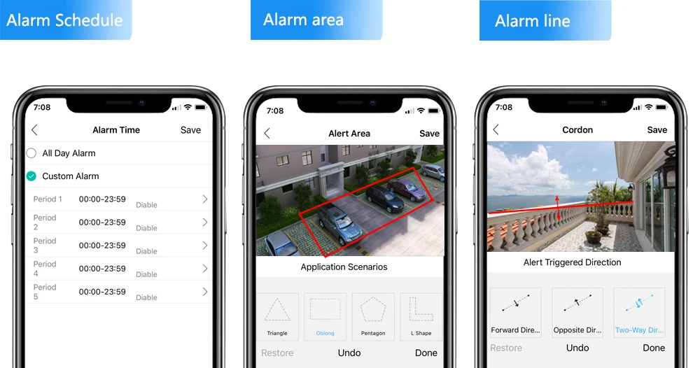 When someone breaks into shooting area, the camera will make alarm sound and alarm messages will be pushed to your Phone APP.