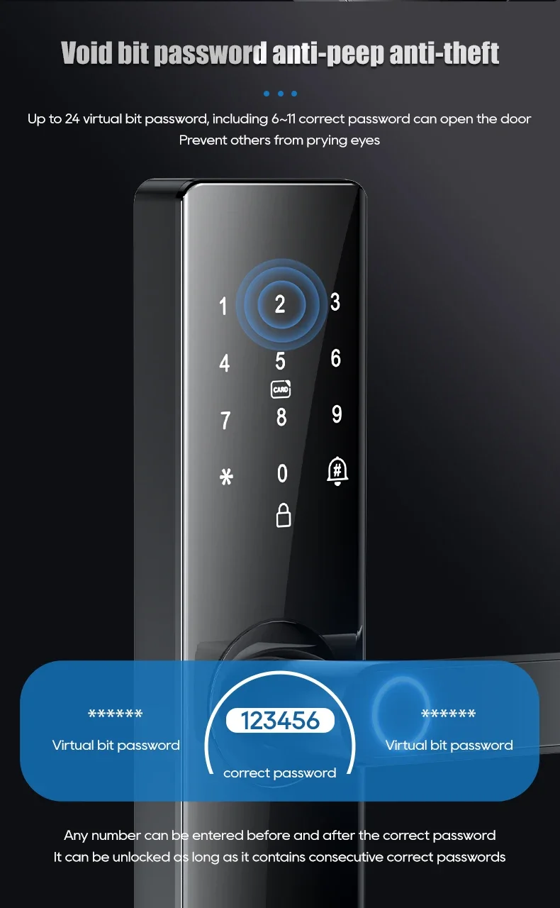 4: Password: Using advanced touch-screen button technology, 12 additional digits can be added before or after the correct password to effectively prevent the lock from being unlocked.