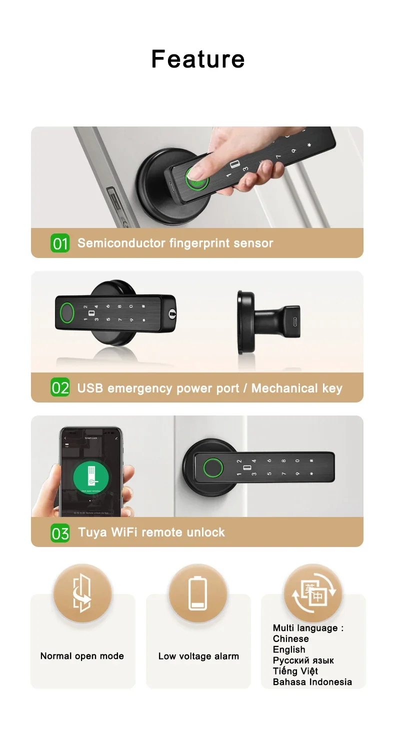 Unlock mode: Fingerprint / Password/ 13.56MHz IC Card/ Mechanical Key ( 2pcs ) / Tuya APP ( WiFi )