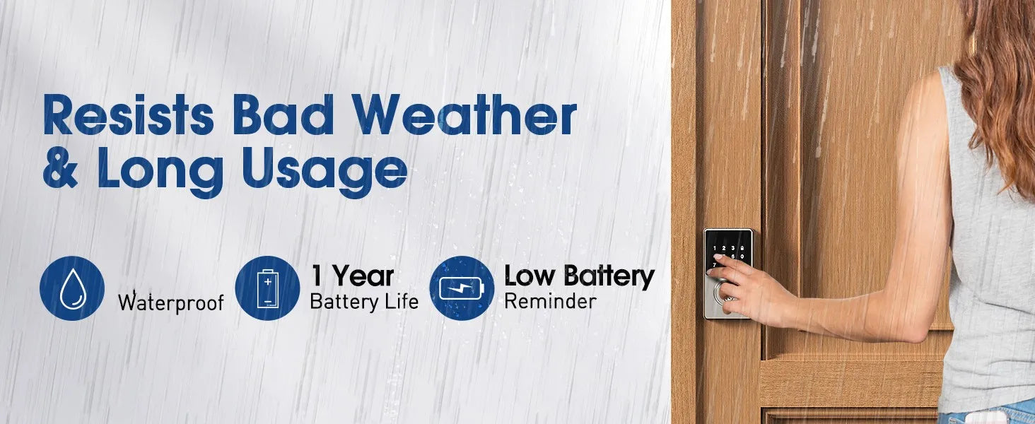 • [Long Lasting and Durable] This electronic door lock features an IP66 waterproof grade to make sure you don't worry about the door lock suffering damage due to bad weather and affecting its use. 4 AA batteries (not included) will last up to 365 days with normal use. If there’s a red light when pressing a button, it means the door locks with keypads are low on battery and you need to replace the battery. It is an ideal electronic door lock for homes, offices, and shops along the street.