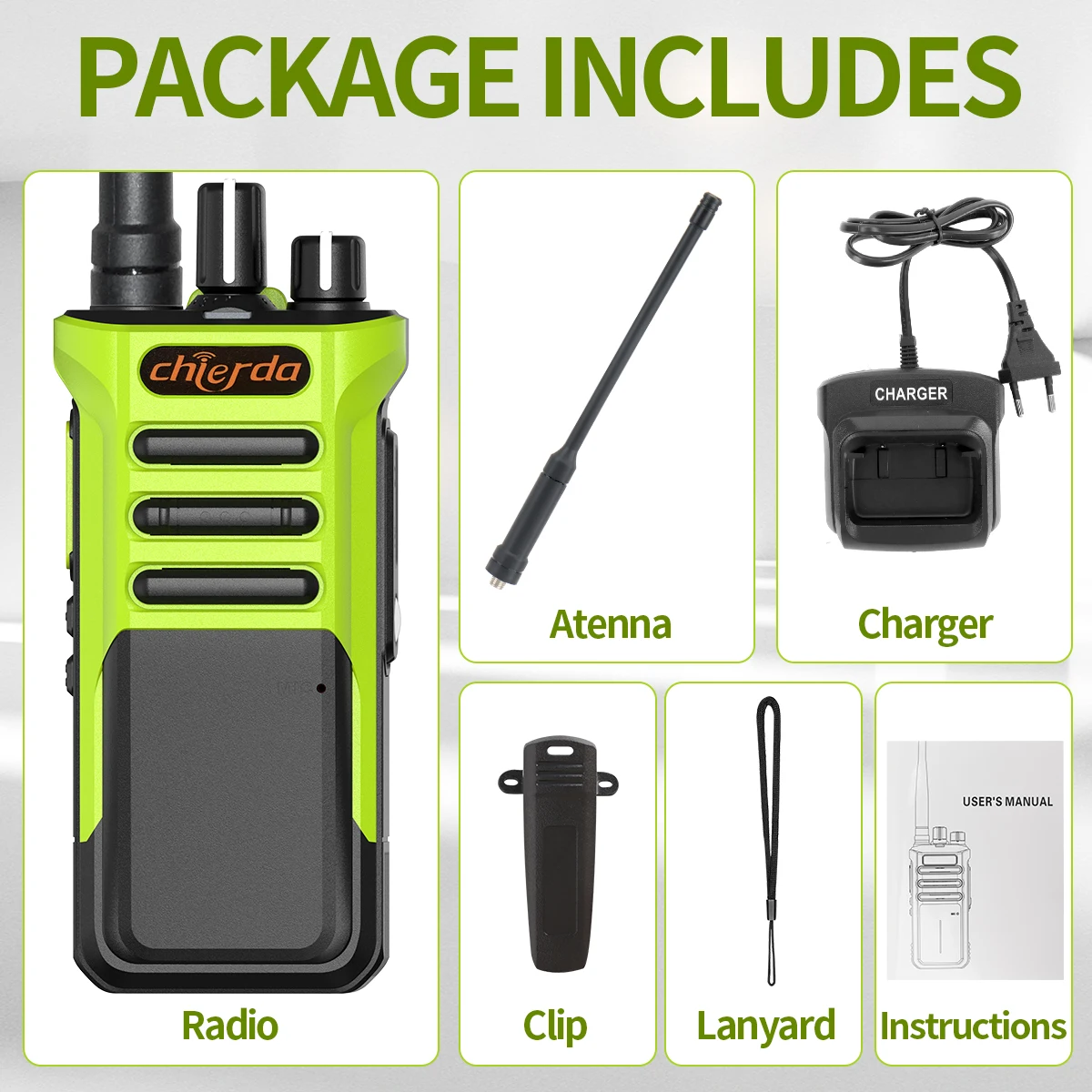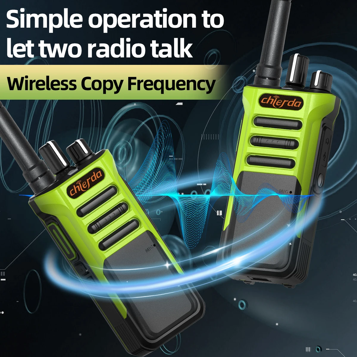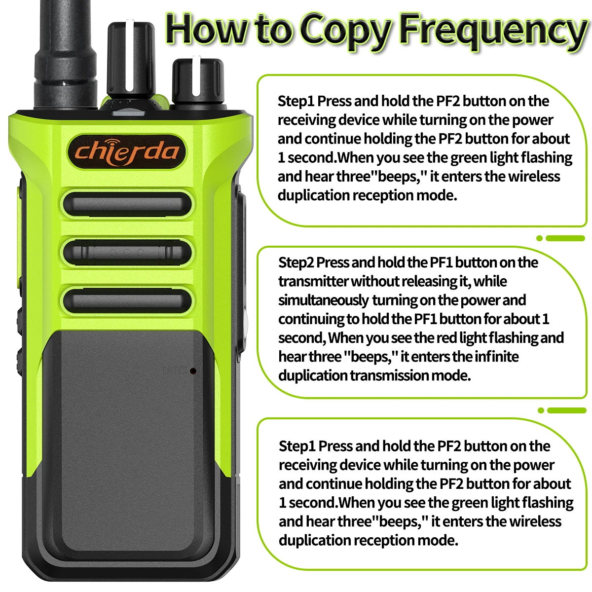 The handheld radio can copy the frequency of any other brand or model of walkie-talkie with a single button, without the need for computer programming. This allows easy communication with other walkie-talkies, overcoming brand and model limitations