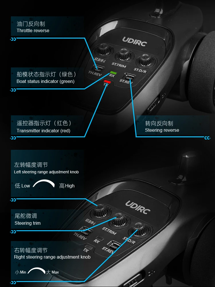 ● Full proportion forward, left and right steering function, rudder size adjustment, right and left steering fine adjustment, capsized ship automatically righting. Low power back.