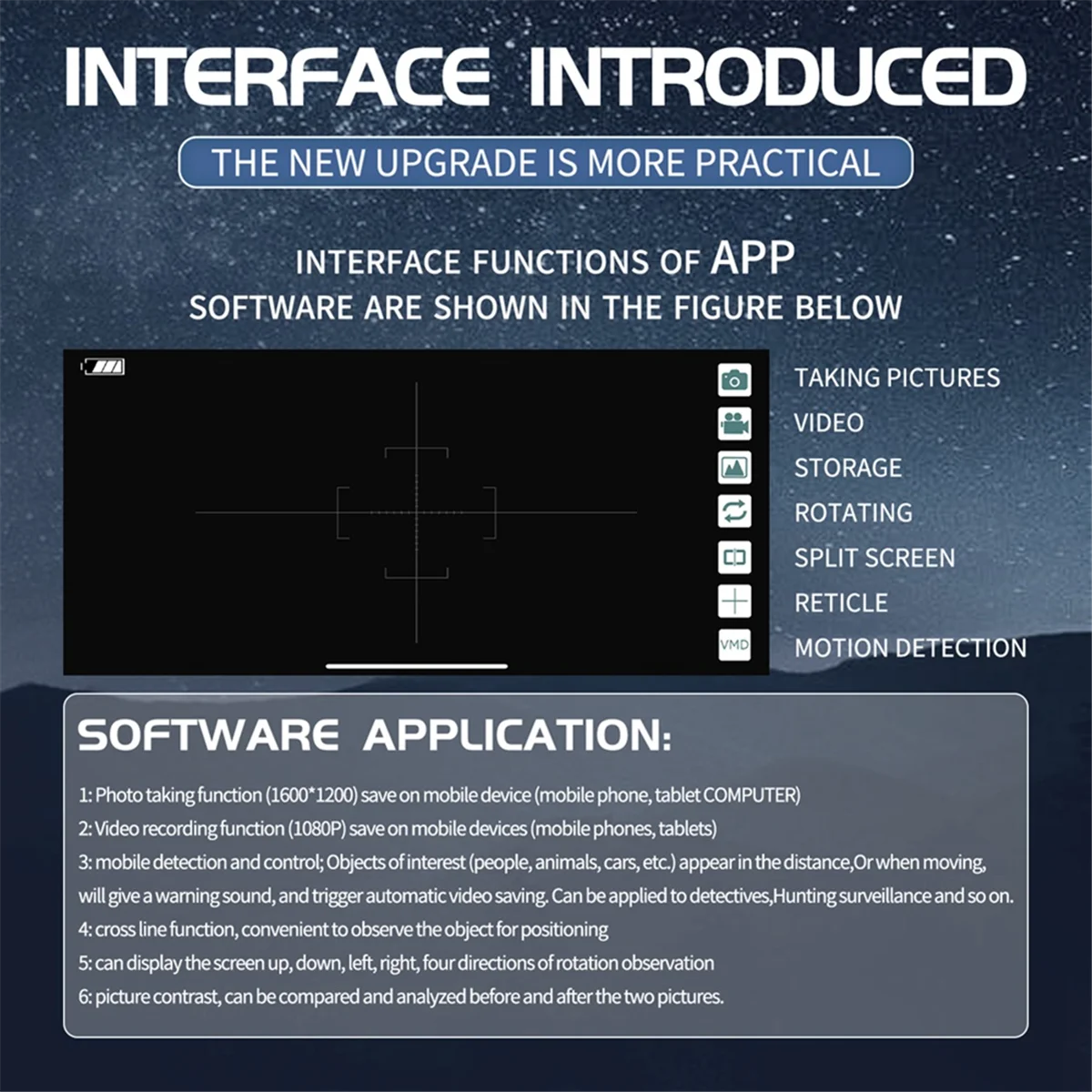 Large Objective Lens: The larger the objective lens caliber, the more light enters the imaging, the sharper the imaging, the clearer the view, and the richer the detail seen. Dual-use: wide ranges of applications, simple to operate, easy to observe and suitable for the animal and landscape viewing. Focusing Knob: One more convenient knob focusing solves the focusing problem and says goodbye to the traditional dual focusing mode. Telescopic Tripod: With a telescopic tripod, the orientation of the transfer, and the stand can be removed. Wide Applications: Long-distance viewing video photography, animal and bird research, farm observations, open-air concerts, sporting events, etc. The mobilephone APP control is available for both Android and IOS systems, the interface function of the APP software: Photo-taking Function: 1600 * 1200 resolution, support save on cellphones, tablets, etc. Video Recording Function: 1080 progressive scanning capabilities, support for saving on mobilephones, tablets, etc. Motion Detection and Control: objects of concern (people, animals, cars, etc.) in the distance, or when moving, will sound a warning, and trigger automatic video preservation. It can be applied to detectives, animal observation, and other areas. Crosshairs Function: which facilitates the observation of objects for localization. Four-directional Observations: The micro-adjustable moving detective can display screen up-and-down, left-and-right, and four directional rotation observations. Screen comparisons: you can compare the front and back of the two screens for analysis. Name: Telescope Battery: 1 * built-in 3.7V, 2000mAh lithium battery (included) Connected devices: Android and IOS cellphones and tablets Sensitive pixels: 2 million Magnification: 70 times (manual focusing structure) Wireless distance: up to 50 meters without obstructions Charging interface: Micro-USB(5V) Colour:Black Material:plastic Package Contents: 1 x WiFi Digital Telescope 1 x USB cable 1 x tripod(random colors, don't accept the specified color) Only the above package content, other products are not included. Note: Light reflection and different displays may cause the color of the item in the picture a little different from the real thing. The measurement allowed error is +/- 1-3cm.